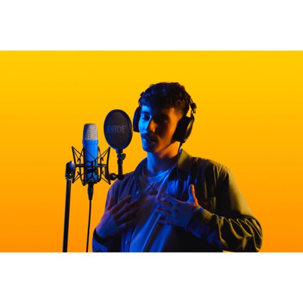 Rode NT1 Signature Cobalt Blue – студійний кардіоїдний мікрофон з великою діафрагмою, HF6 1-дюймовий конденсаторний капсуль, діапазон частот 20 Гц - 20 кГц, опір 100 Ом, максимальний SPL 142 дБ, еквівалентний шум (A-зважений) 4 дБА, чутливість -32 дБ, фантомне живлення 48V, підключення 3-pin XLR, колір синій, в комплекті: кріплення зі змінним попфільтром SM6, кабель XLR, виготовлено в Австралії.