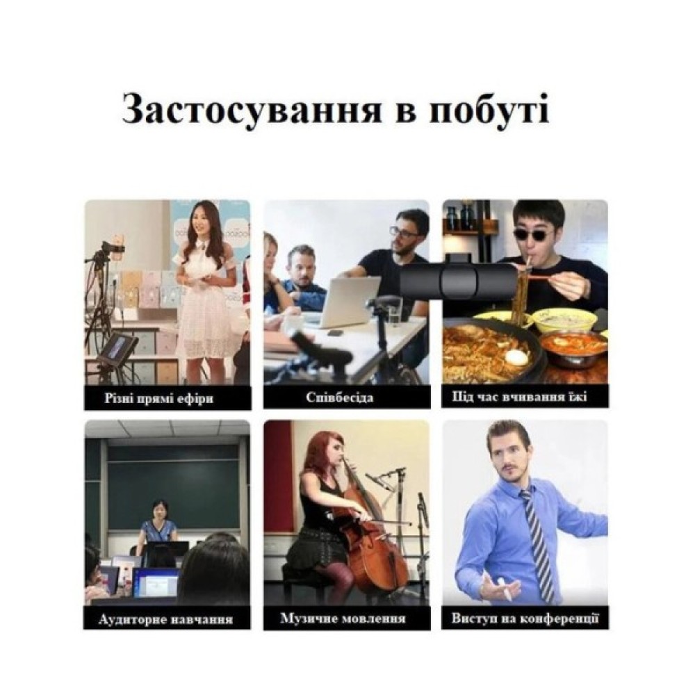 - Дана система радіо мікрофона складається з приймача (ресивера), що підключається до смартфону і мікрофона петлички з передавачем, що закріплюється на одязі. Дальність зв'язку по радіоканалу становить до 20 метрів при прямій видимості, тому ви зможете використовувати цей радіомікрофон як у приміщенні, так і на вулиці; Щоб розпочати запис, його достатньо підключити до телефону;
