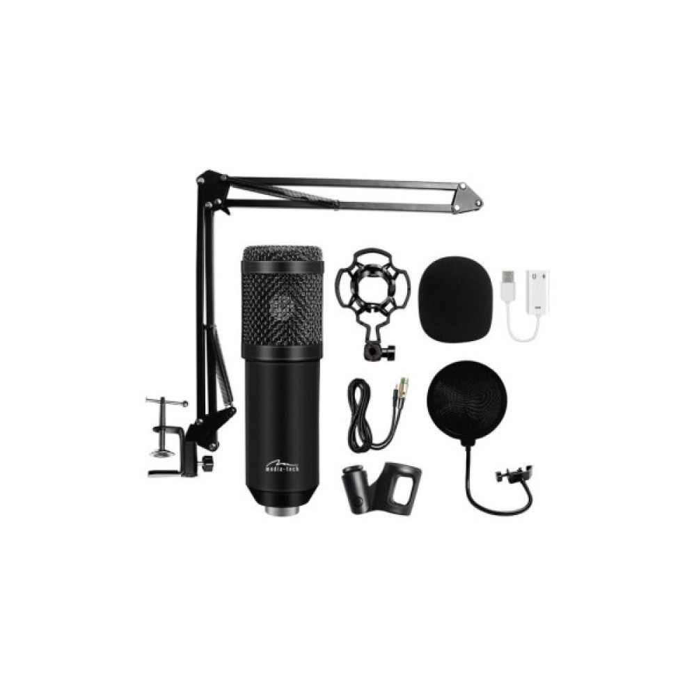 Ігровий стрім мікрофон Media-Tech професійний набір XLR - це набір для потокового і студійного запису звуку. Він включає в себе конденсаторний мікрофон, регульовану настільну підставку, поп-фільтр, антивібраційний кошик, губчастий обтічник, зовнішню звукову карту та проводку.