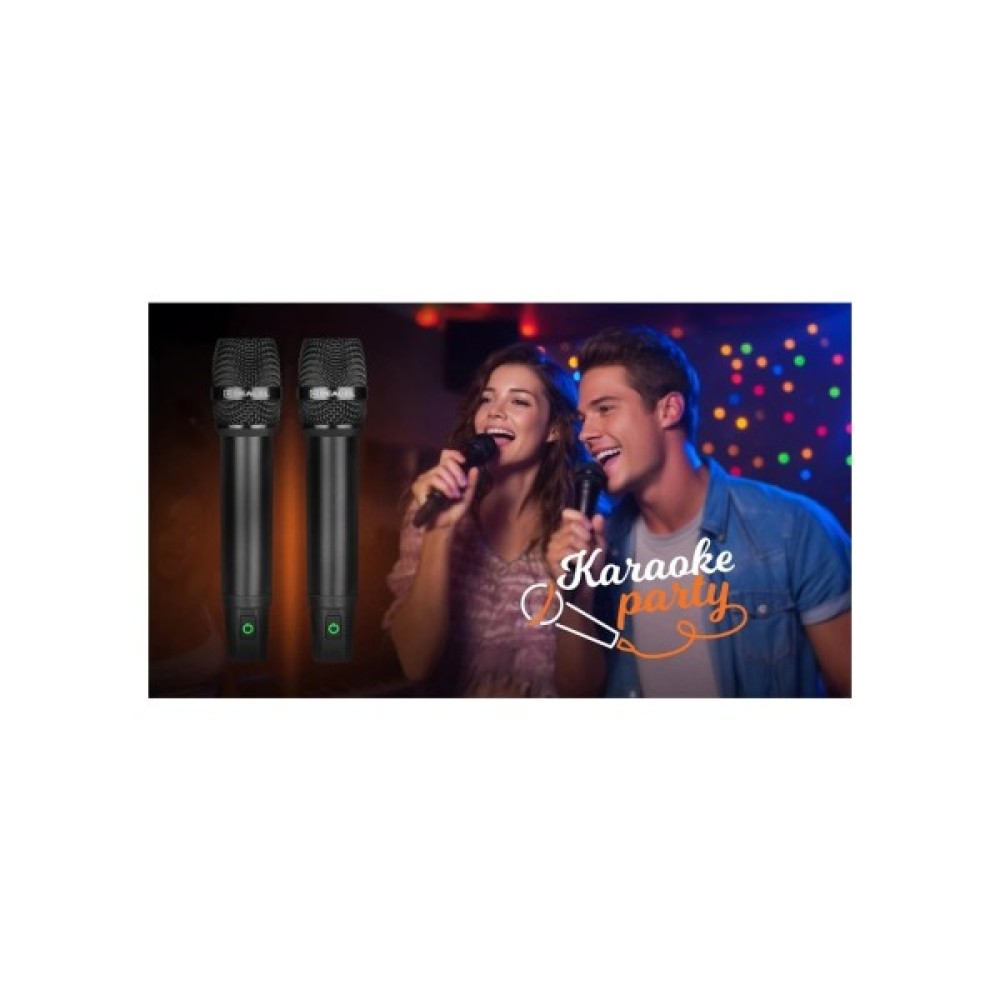 Два мікрофони дозволяють співати дуетом, вести заходи або змагатися в караоке без черг і пауз. Кожен мікрофон забезпечує чисту, гучну та розбірливу передачу голосу з підкресленою серединою та ефективним шумозаглушенням — звучать саме голоси, а не фон.