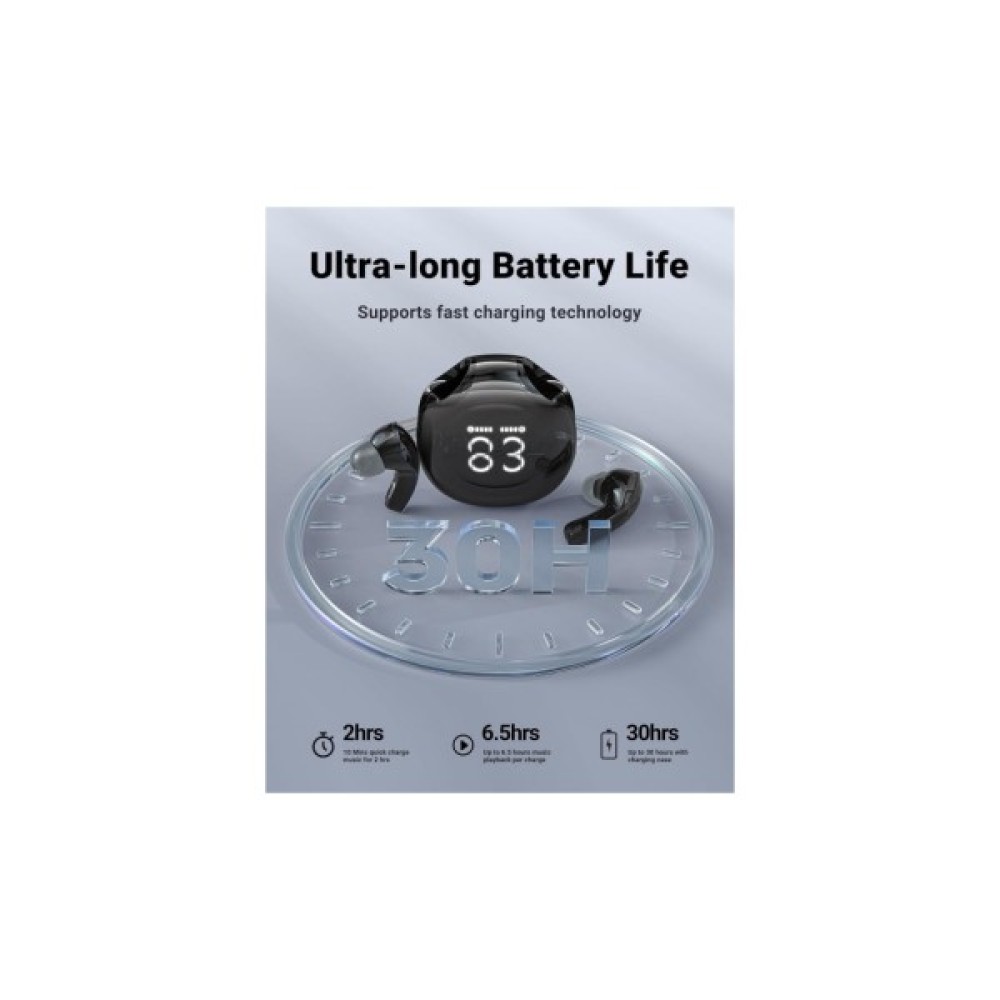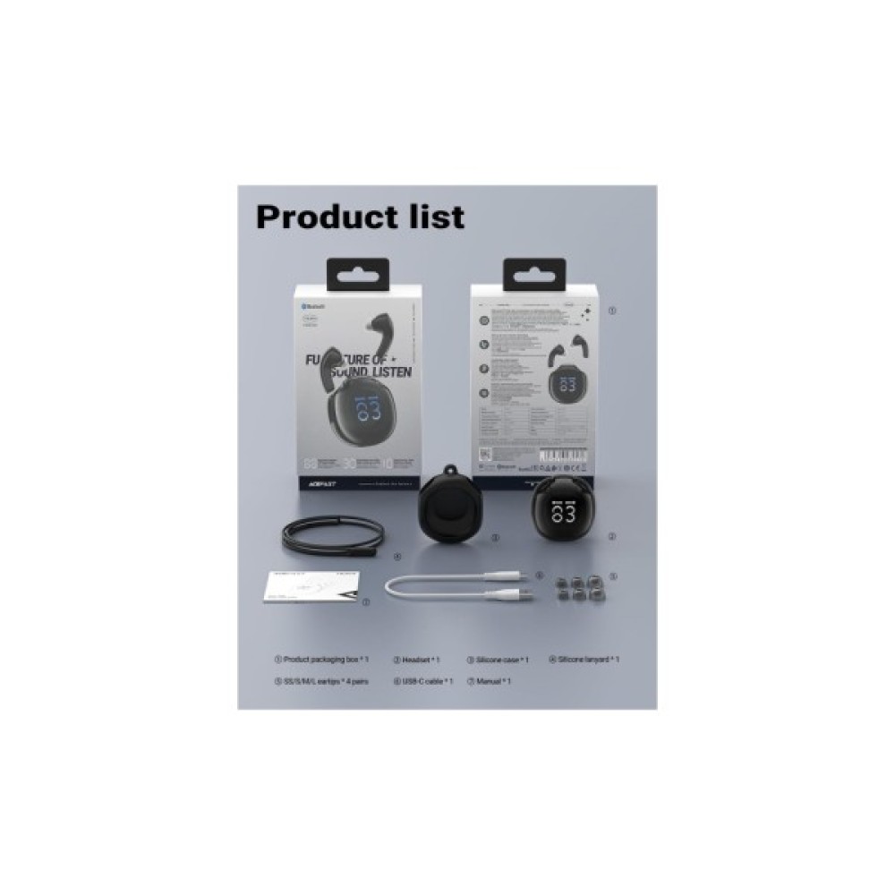 Цифровий дисплей на зарядному футлярі завжди наочно показує рівень заряду, дозволяючи вчасно підзарядити навушники. Насолоджуйтесь насиченим і деталізованим звучанням з Acefast T9 Obsidian Black та відкрийте для себе новий вимір свободи, якості та елегантності у світі музики. Ці навушники стануть вашими надійними супутниками, забезпечуючи незабутні моменти насолоди звуком, повсякчас перебуваючи на крок попереду.