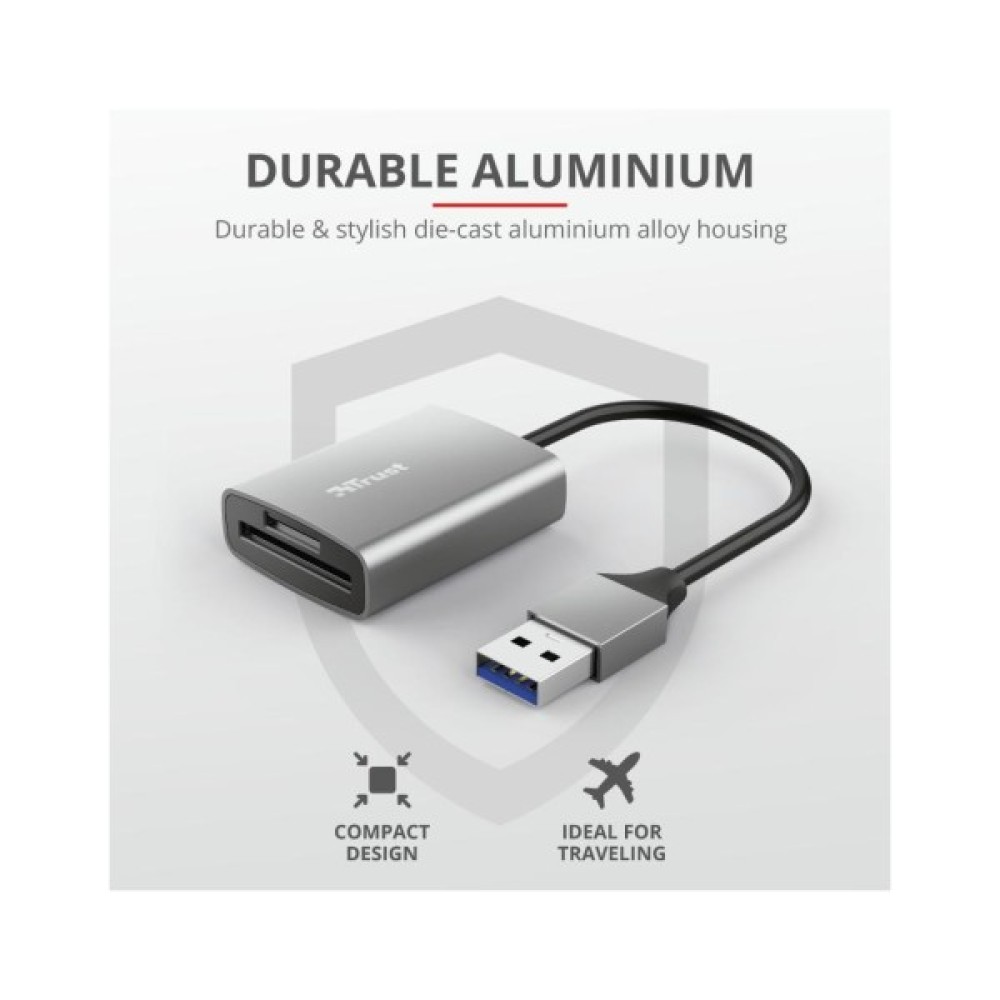 Маленький і сильнийВи завжди візьмете з собою Trust Dalyx. Він настільки малий, що ви навіть не помітите його в сумці, а литий під тиском алюмінієвий корпус захищає кард-рідер від небезпек зовнішнього світу. Він поставляється з коротким USB-кабелем, який позбавить вашу сумку і стіл від безладу, а оскільки він працює як з SD, так і з micro SD картами, Trust Dalyx стане ідеальним компаньйоном для будь-якого фотографа, документаліста або ентузіаста екстремальних видів спорту.