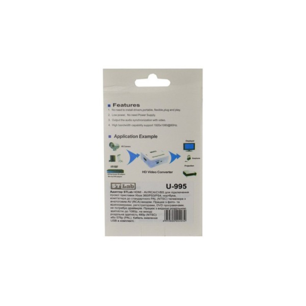 Адаптер STLab U-995 HDMI - AV / RCA / CVBS перетворює цифровий HDMI сигнал в аналоговий AV (RCA, CVBS) відео сигнал, використовується для підключення ігрової приставки Xbox 360 / PS3 / PS4, ноутбука, комп'ютера до стандартного PAL (NTSC) телевізора з аналоговим AV (RCA) входом.