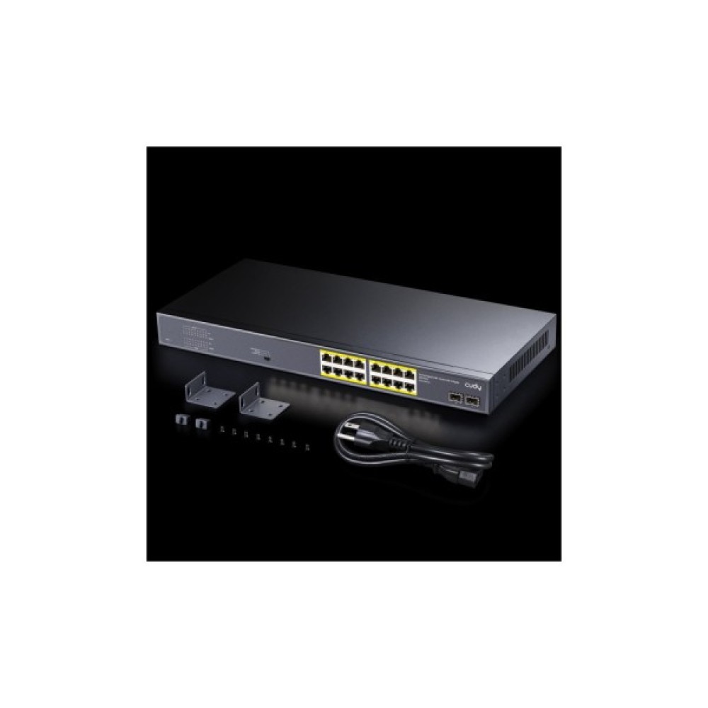 Комутатор оснащений 18-ма портами, 16 з яких Gigabit PoE+ та 2 Gigabit SFP для підключення до оптоволоконної мережі на великих відстанях.