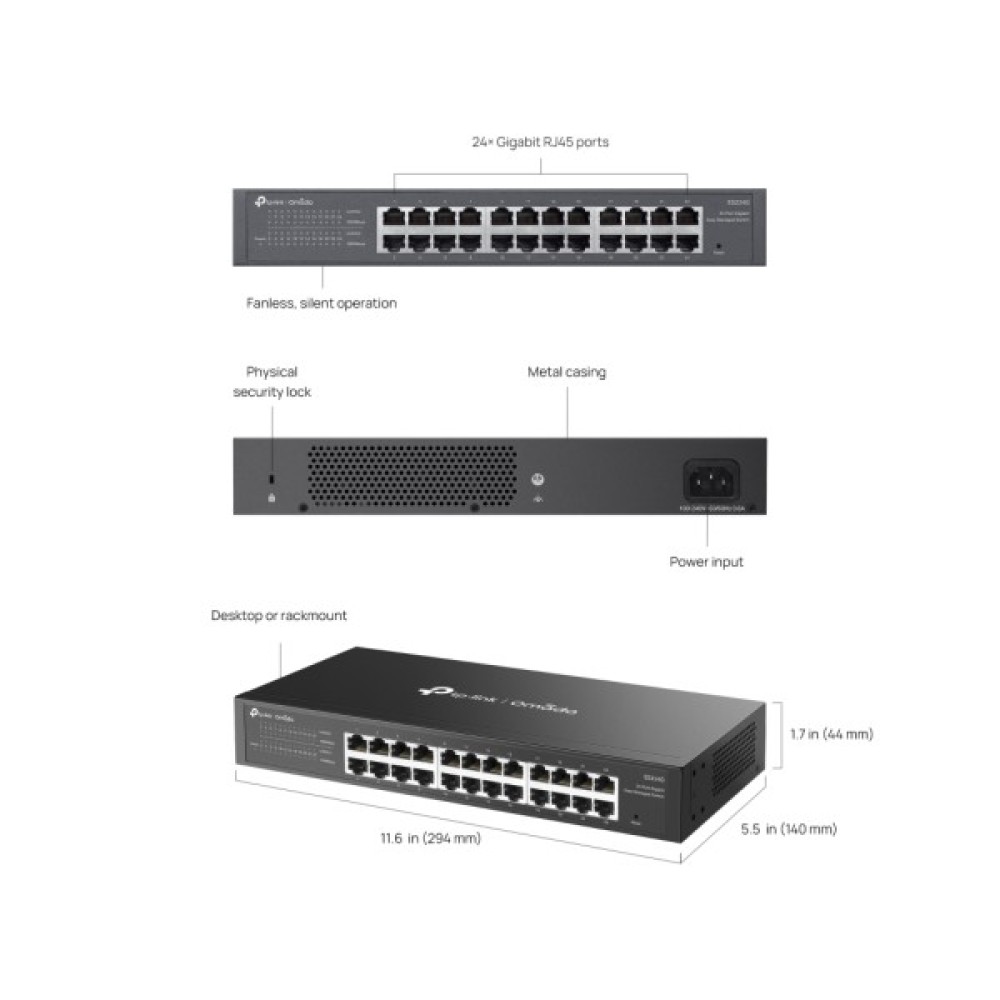 TP-LINK ES224G – це 24-портовий гігабітний WebSmart-комутатор серії Omada. Забезпечує швидке підключення, хмарне керування, VLAN, ізоляцію портів, IGMP Snooping та QoS для стабільної роботи мережі. Безвентиляторна конструкція гарантує тишу, а металевий корпус підходить для настільного та стійкового монтажу.