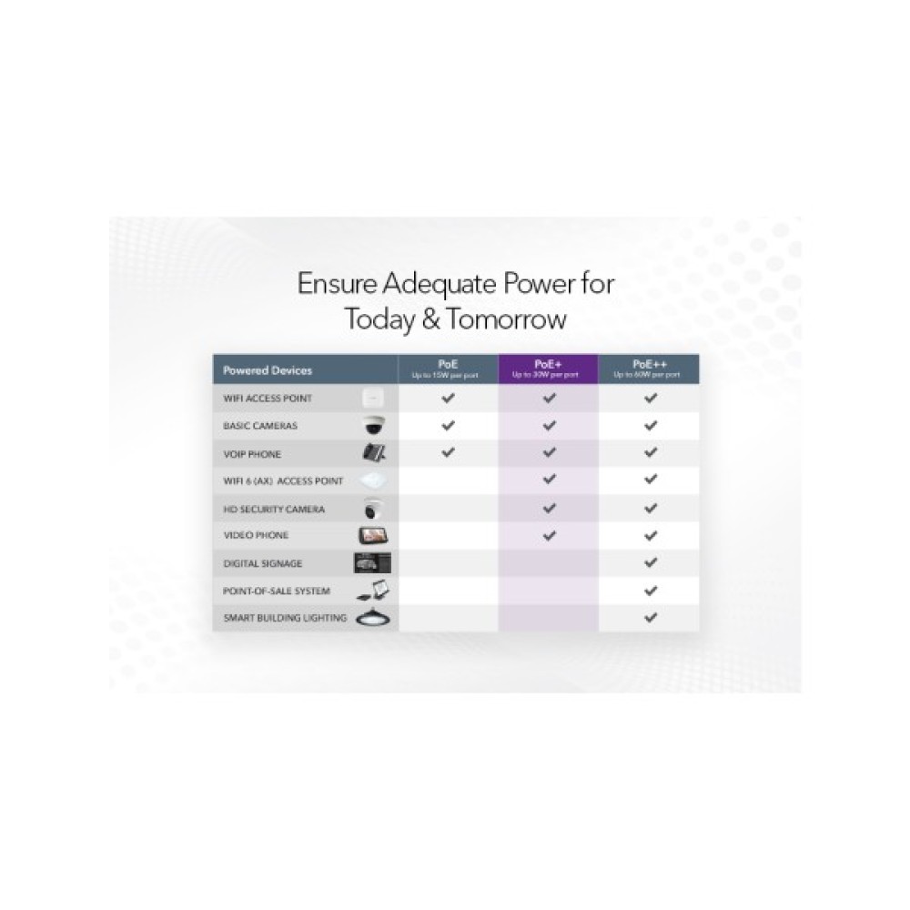 Особливо варто відзначити унікальну технологію NETGEAR FlexPoE. Вона дозволяє комутатору автоматично керувати розподілом потужності, враховуючи індивідуальні потреби підключених пристроїв. Це підвищує ефективність роботи та мінімізує споживання енергії. Загальний бюджет потужності PoE складає 123 Вт, забезпечуючи до 30 Вт на порт, що дозволяє з легкістю підключати IP-камери, VoIP-телефони та бездротові точки доступу.