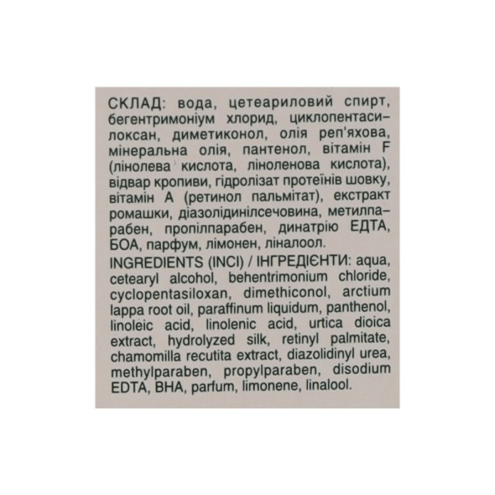 aqua, cetearyl alcohol, behentrimonium chloride, cyclomethicone, dimethiconol, arctium lappa root oil, paraffinum liquidum, panthenol, linoleic acid, linolenic acid, urtica dioica extract, hydrolyzed silk, retinyl palmitate, chamomilla recutita extract, diazo- lidinyl urea, methylparaben, propylparaben, disodium EDTA, BHA, parfum, butylphenyi methylpropional, limonene, linalool.
