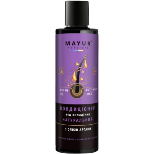 Натуральний біо-кондиціонер Mayur з арганою виготовлено з рослинних компонентів, без додавання парабенів, SLES/SLS, силіконів та мінеральних олій.
