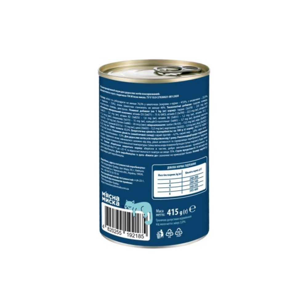 М'ясна Миска пропонує смачний і поживний вологий корм для котів, який сподобається вашим улюбленцям. Цей корм складається з ніжних шматочків індички в ароматному соусі, що забезпечує вашого кота необхідними нутрієнтами і робить його їжу ще більш апетитною.Переваги:Смачні шматочки індички: Корм містить високоякісні шматочки м'яса індички, що є джерелом білка і підтримує м'язову масу вашого кота.Ароматний соус: Соус робить корм більш смачним та привабливим, стимулюючи апетит навіть у найвибагливіших котів.Збалансоване харчування: Забезпечує всі необхідні елементи для підтримки здоров'я і енергії вашого вихованця.