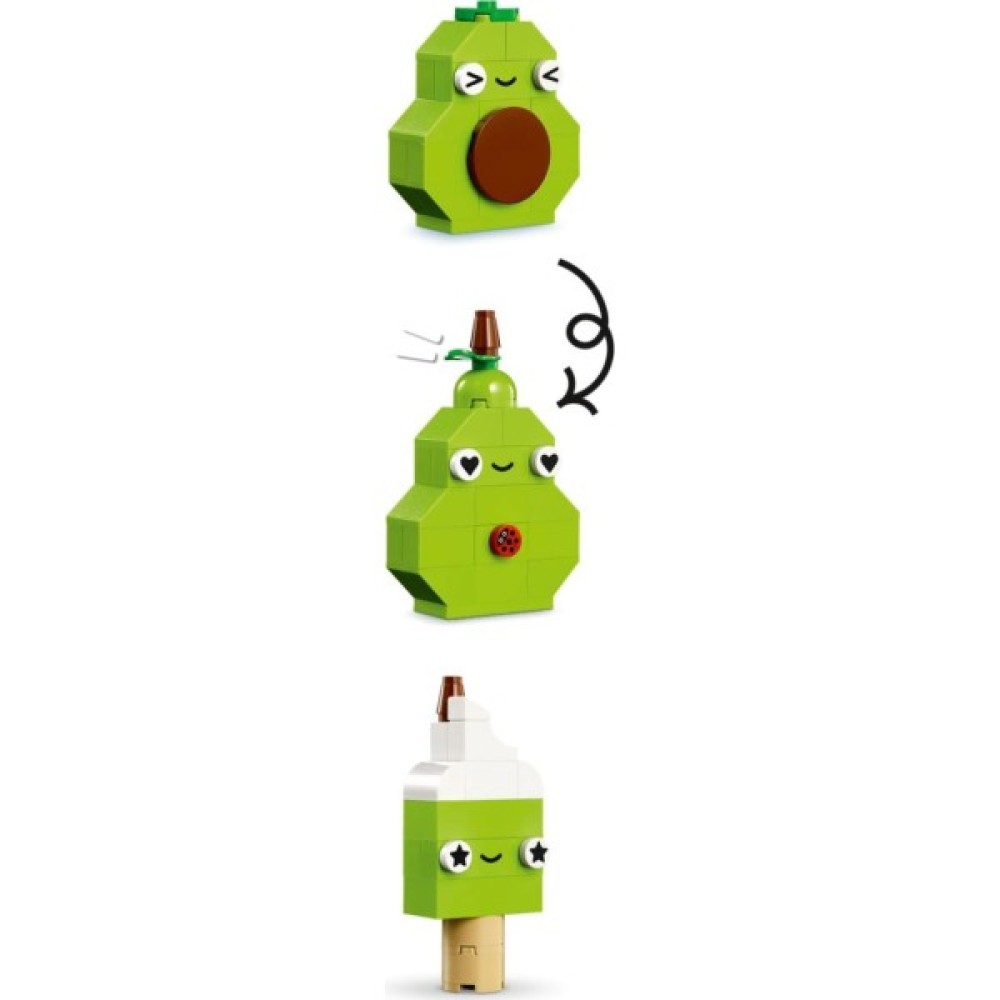 Дозвольте своїй малечі поринути у світ творчості з цим унікальним набором. Спеціальні елементи, такі як очі, роти та інші декоративні деталі, допоможуть вашим дітям створити веселі образи: кекси, морозиво, авокадо і навіть тако. Використовуючи інтуїтивний посібник, діти легко опанують нові конструкторські навички, створюючи багаторівневі шедеври: від торта із декором до чарівної груші чи паніні.