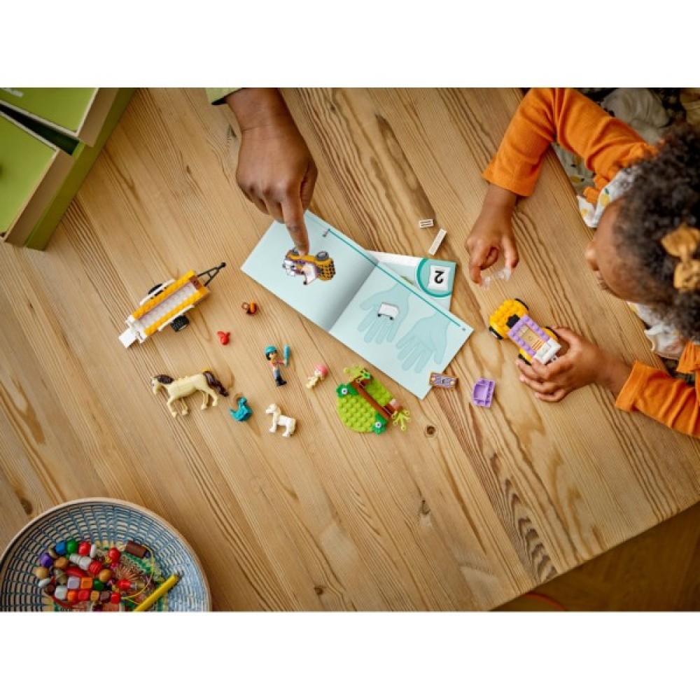 Цей конструктор із серії LEGO Friends підходить для дітлахів від 4 років, як для дівчаток, так і для хлопчиків. Його наземний транспорт і тварини створені для безпечної гри завдяки високоякісному пластику, з якого виготовлені всі елементи. Процес складання стає ще цікавішим з додатком LEGO Builder, де діти можуть масштабувати й обертати моделі в 3D, стежити за прогресом.