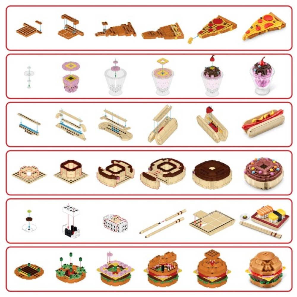 У комплекті на вас чекають шість унікальних смаколиків, які можна колекціонувати: від соковитих бургерів до освіжаючого морозива і автентичних суші. Завдяки детальним інструкціям у картинках, збирання стане не тільки цікавим, але й захоплюючим процесом. Доступні деталі сумісні з конструкторами провідних брендів, що дозволить легко інтегрувати їх у вже наявну колекцію та розширити її межі.