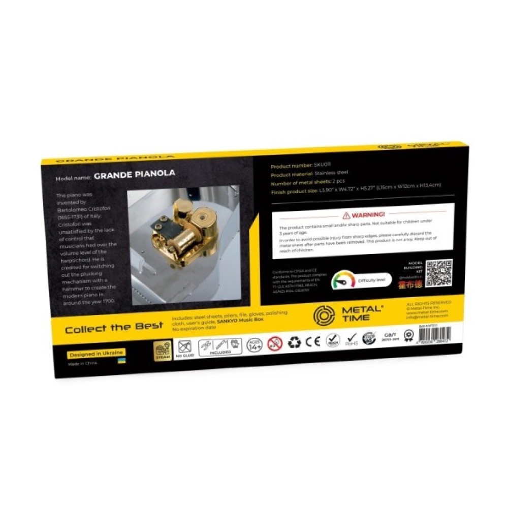 Конструктор Metal Time Grande Pianola (MT011) – це ваш квиток у світ інженерної творчості та музичного мистецтва, де кожна деталь говорить про вишуканість і стиль. Цей вражаючий 3D-конструктор з 22 металевих елементів призначено для юнаків віком від 14 років, які мріють розширити горизонти своїх технічних і творчих здібностей. Його матове металеве покриття з високотехнологічної сталі AISI 304 гарантує не лише гіпоалергенність та довговічність, а й безпечність та естетичність моделі.