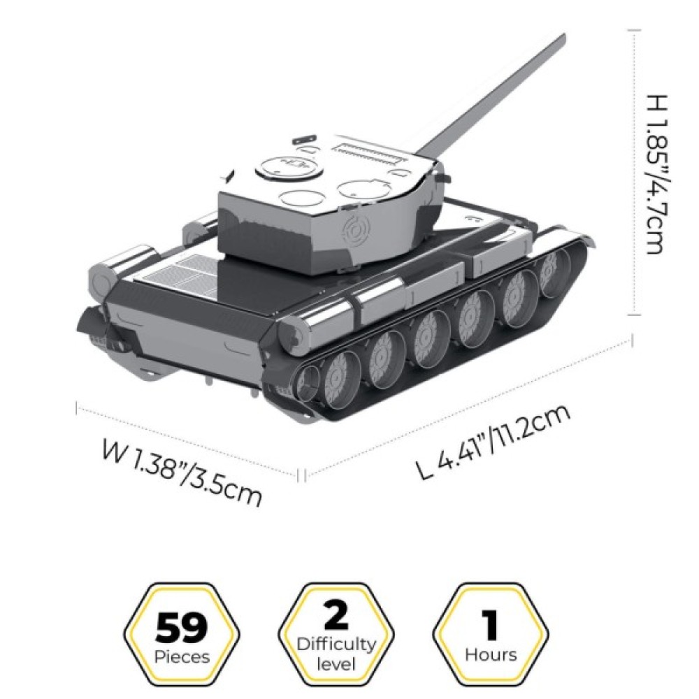 Загальна кількість деталей в наборі становить 59 одиниць, виконаних з високоякісного металу, що гарантує довговічність та стійкість моделі. Зібраний танк досягає розмірів 11.2х4.7х3.5 см, що робить його не лише прекрасним декоративним елементом, а і цінним доповненням до вашої колекції.