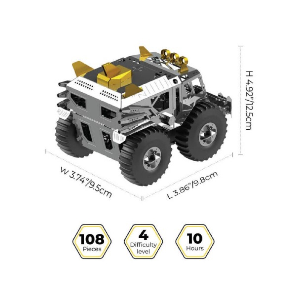 Вражаючий розмір зібраної моделі — 9.5х9.8х12.5 см — дозволяє повністю відчути унікальність та функціональність всюдихода. Головною особливістю цієї моделі є великі колеса з бортовою системою надування, що робить його незамінним для пересування по воді, подолання заростей чи руху по тонкому льоду. Ця технологія відображає справжні можливості реальних транспортних засобів, пристосованих до пересіченої та сирої місцевості.