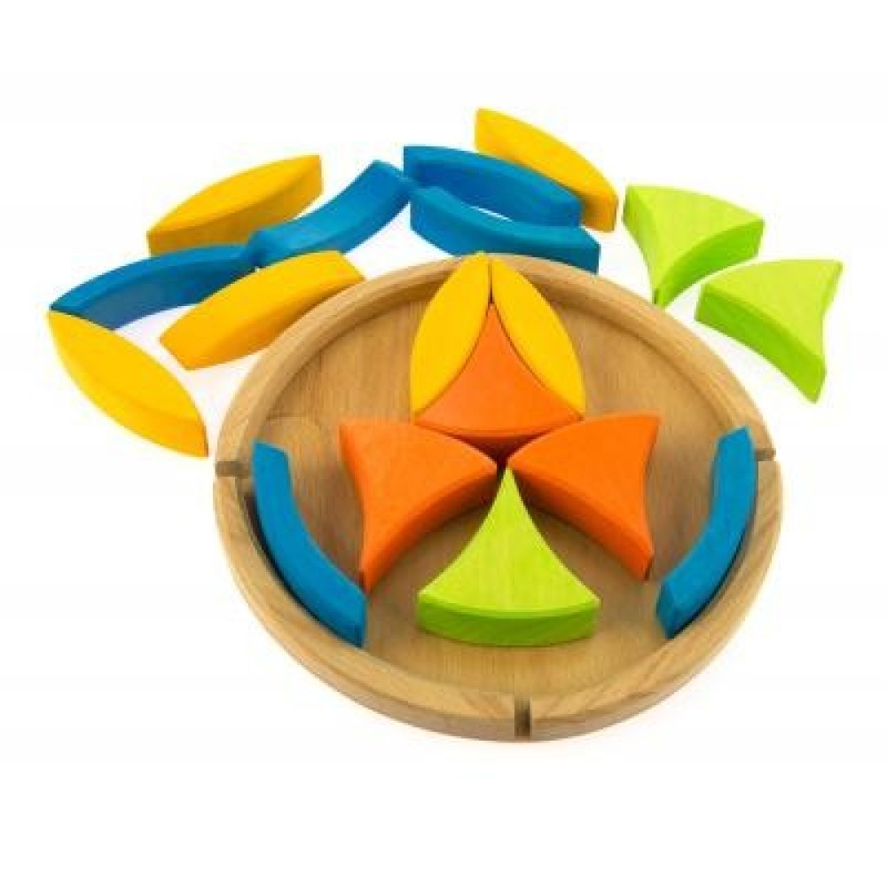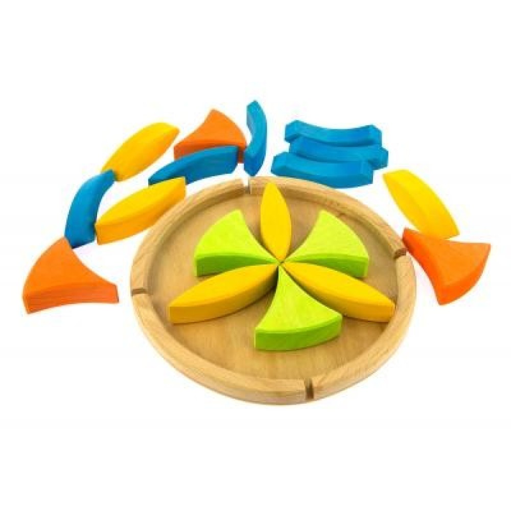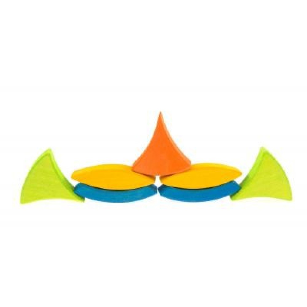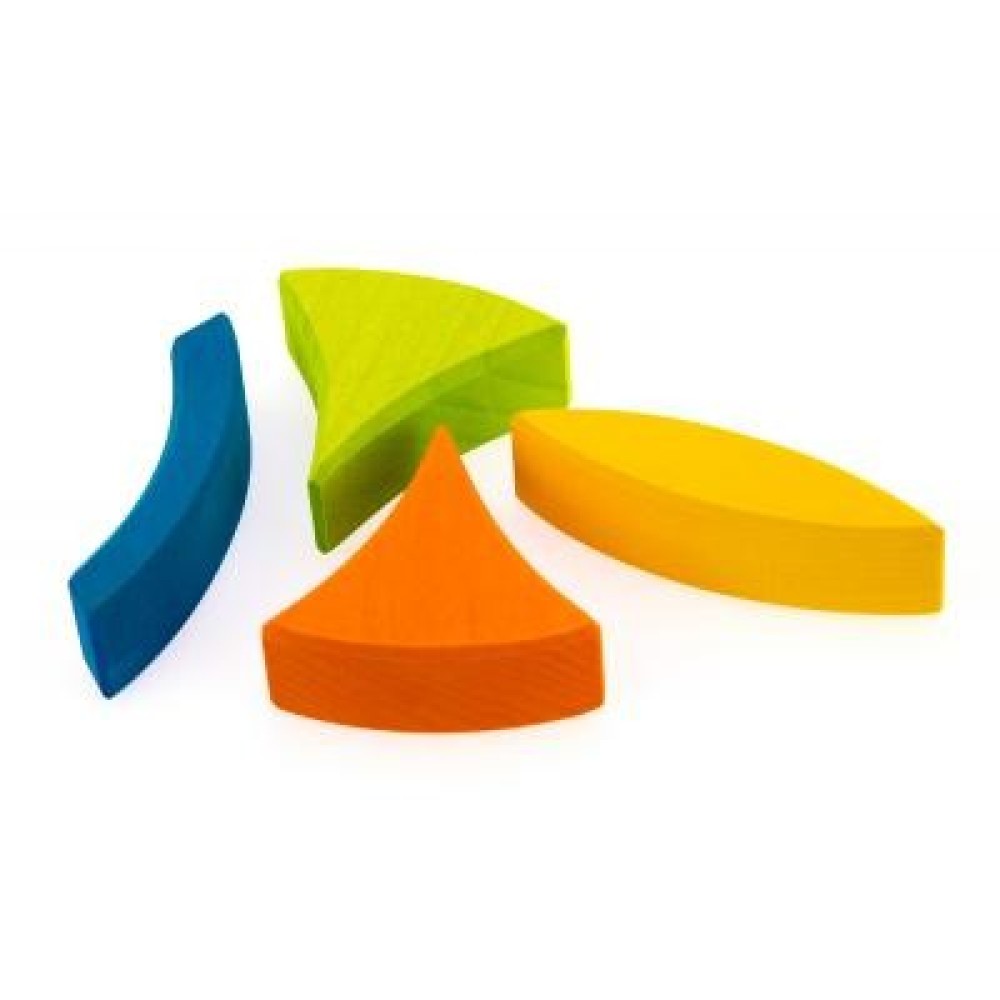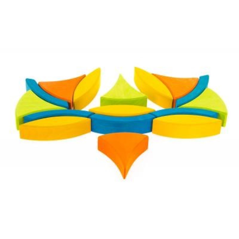 Всі елементи конструктора виготовлені з натурального дерева та вкриті матовими фарбами на водній основі. Це надає поверхні бархатистий ефект, підкреслюючи природну текстуру матеріалу. Завдяки якісній обробці, деталі мають приємну на дотик поверхню, яка не ковзає в руці, що забезпечує комфорт і безпеку під час гри. Різноманіття відтінків – від блакитних до теплих помаранчевих – створюють атмосферу справжнього літа, захоплюючи увагу як хлопчиків, так і дівчаток.