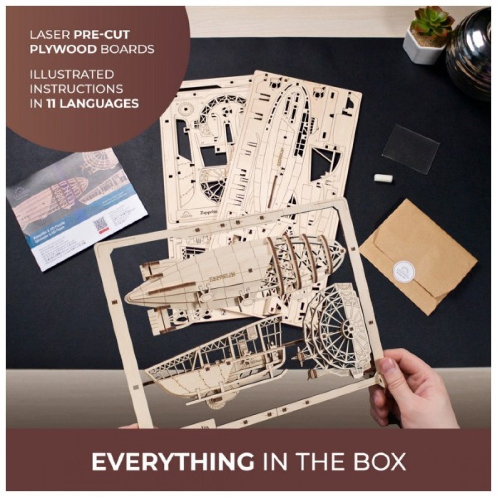 Завдяки легкому рівню складності, Цепелін зрозумілий навіть для новачків, а час складання не перевищує 20-30 хвилин. Витонченість деталей, зокрема збільшеної кабіни, дозволяє розглянути дирижабль з різних ракурсів. Оберіть Ugears для отримання краси, що оживає у ваших руках, і доторкніться до історії через унікальний дизайн.