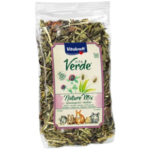 Натуральна суміш VitaVerde з подорожника та конюшини є овочевою основою додатково до різних дієт. Смачний подорожник славиться своєю заспокійливою і протизапальною дією, а червона конюшина покращує травлення та стимулює апетит. Склад багатий вітамінами та мінеральними речовинами. У конюшині міститься велика кількість кальцію і фосфору, що допомагає вберегти кроленят від рахіту та інших захворювань. Смачна суміш із багатих на вітаміни трав урізноманітнює раціон вашого улюбленця. Використовується як добавка до основного раціону.