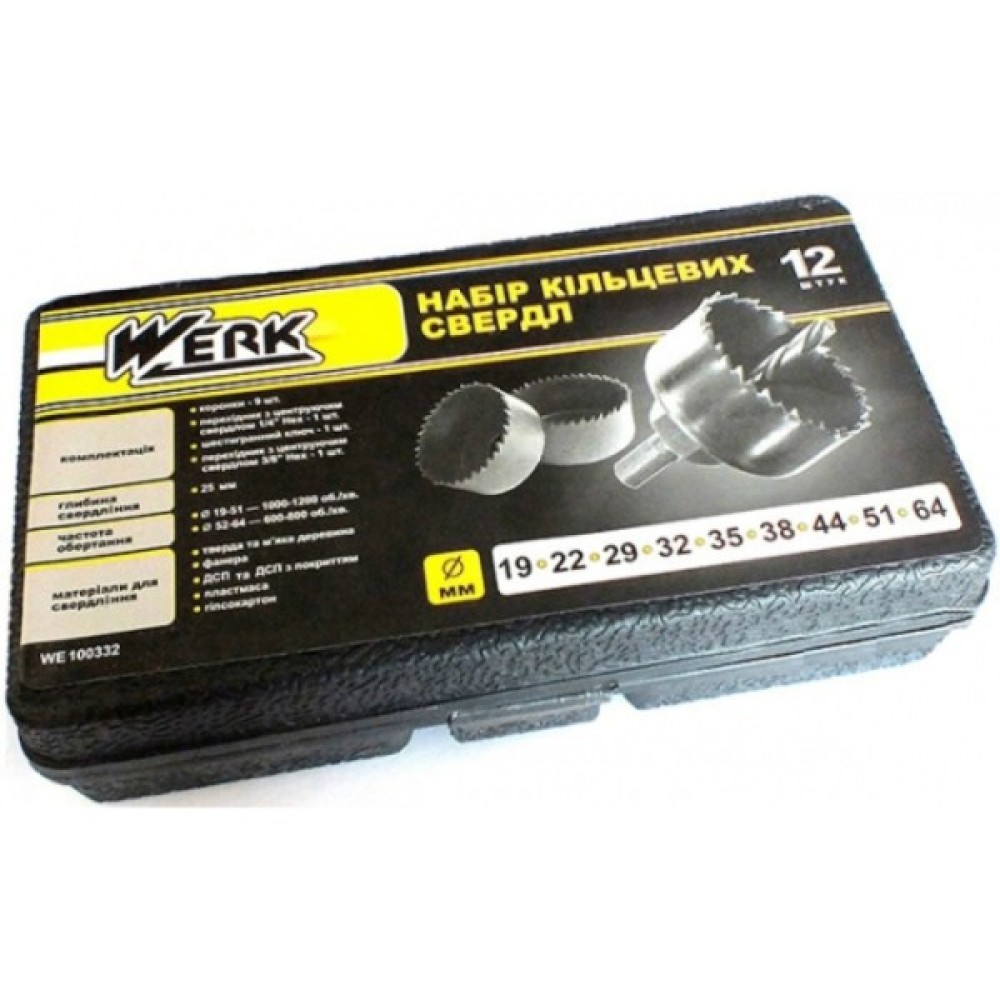 У набір Werk WE100332 входить набір коронок із 9 штук з такими розмірами — 19/22/29/32/35/38/44/51/64 мм.