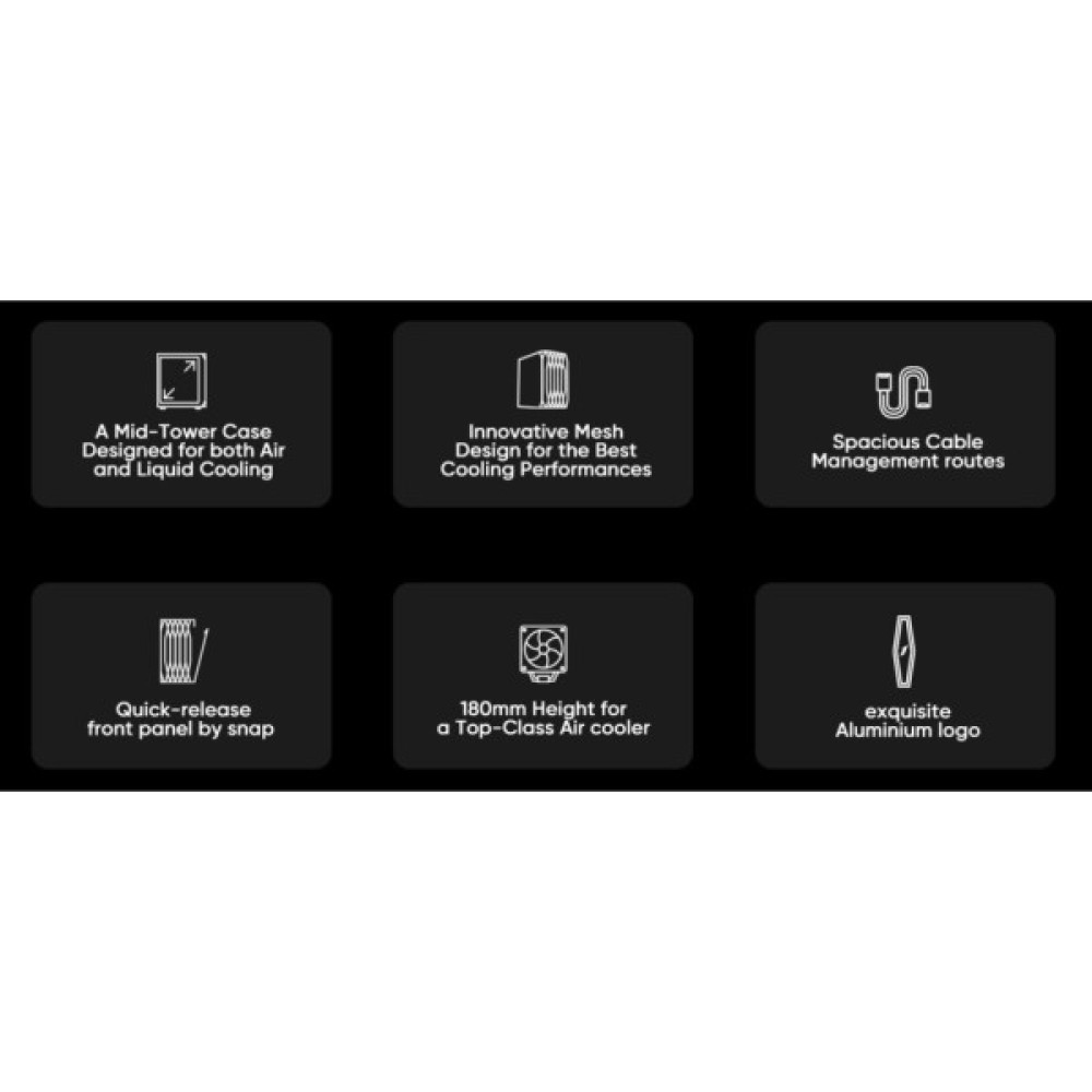 Корпус не постачається з блоком живлення, однак передбачене його нижнє розташування дозволяє впевнено керувати кабельним менеджментом та забезпечує додаткову стабільність конструкції. Це рішення також сприяє покращенню повітряного потоку, зменшуючи навантаження на системи охолодження.