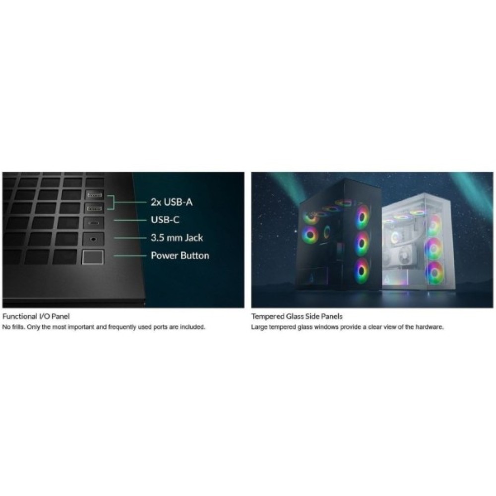 Дизайн Arctic XTENDER BLK вишуканий і елегантний: насичений чорний колір корпусу поєднаний з прозорою боковою панеллю. Це дозволяє демонструвати внутрішній простір з усіма встановленими компонентами та RGB-підсвіткою, перетворюючи ваш ПК на справжній витвір мистецтва, вартий захоплення.