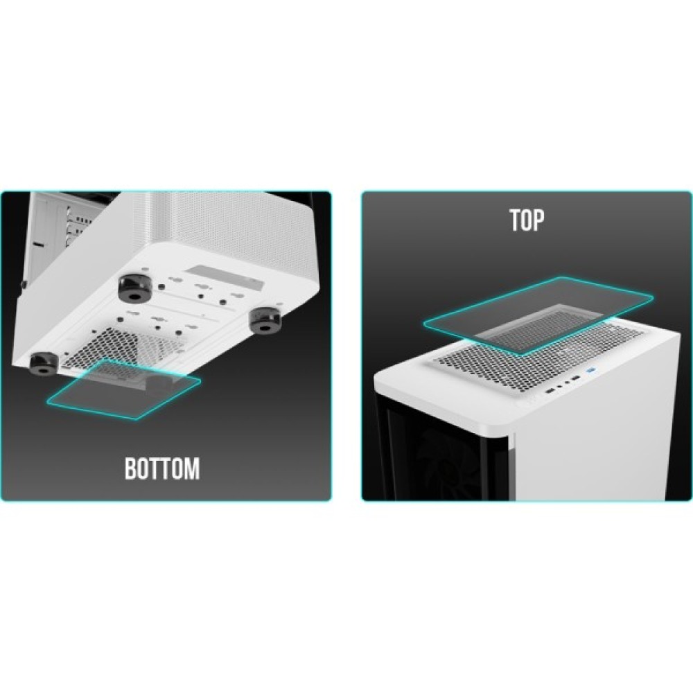 Грамотний розподіл елементів у Gamdias TALOS E3 CG WH забезпечує оптимальну вентиляцію. Додаткові місця для вентиляторів пропонують розміщення двох 120 мм вентиляторів на верхній панелі, одного 120/140 мм на передній та двох 120 мм на нижній панелі, оптимально розподіляючи повітряний потік для максимального охолодження. Пилові фільтри на верхніх і нижніх панелях ефективно захищають від забруднень, підтримуючи чистоту внутрішнього середовища та ефективність системи.