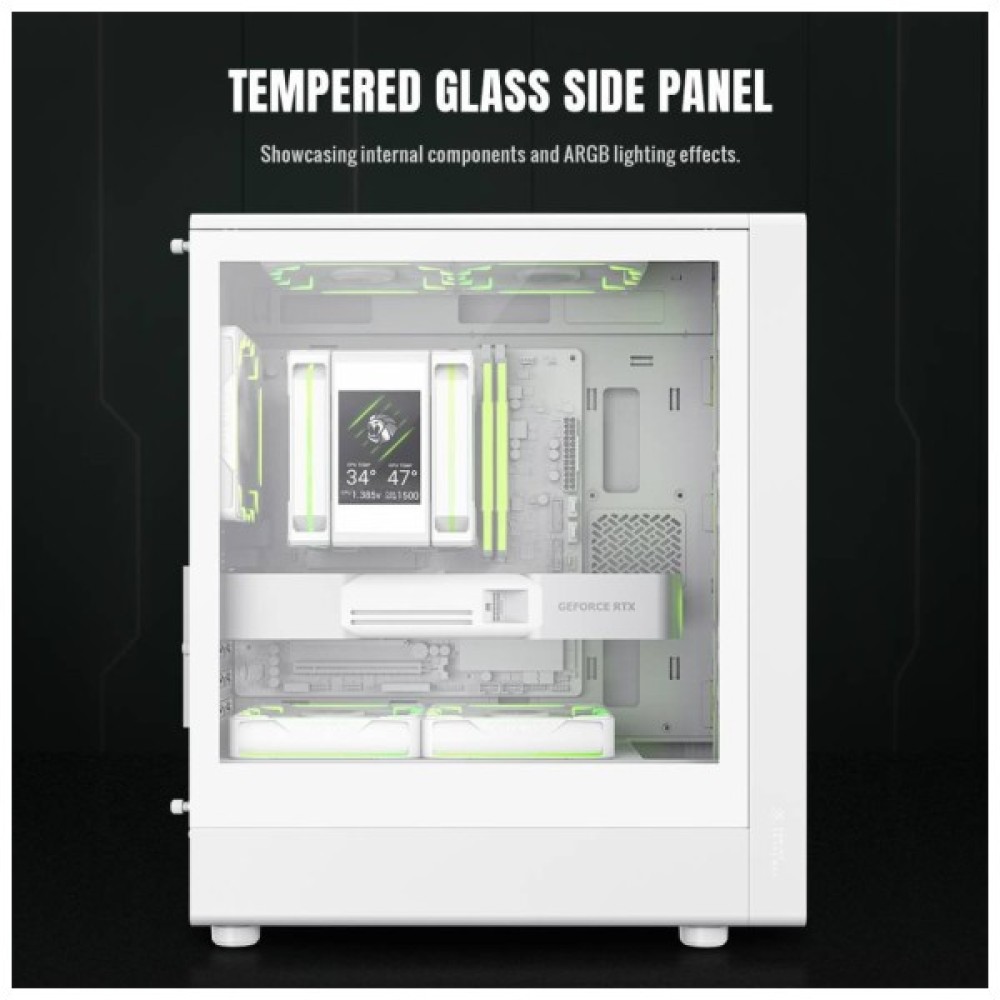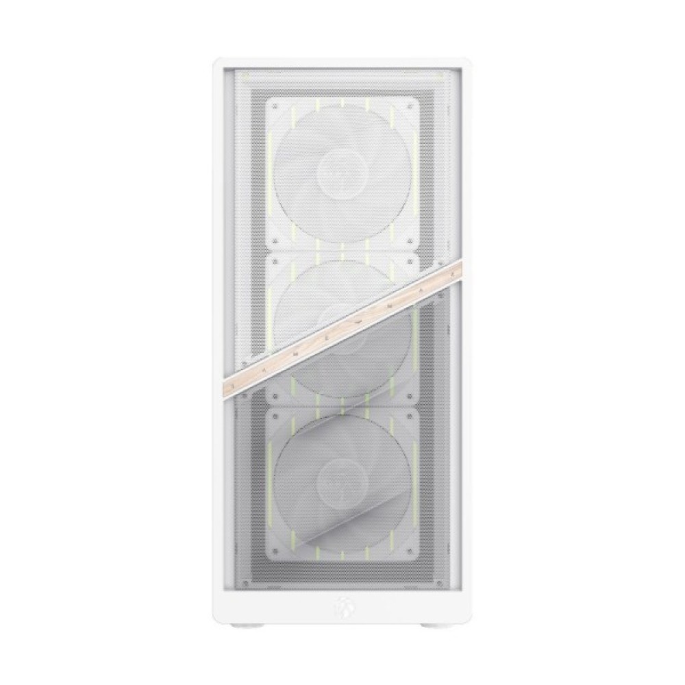Система охолодження в цьому корпусі заслуговує на окрему увагу. Завдяки передній сітчастій панелі з високим коефіцієнтом повітряного потоку та вертикальному розташуванню компонентів, теплове розсіювання значно оптимізовано. У корпусі можна розміщувати до восьми 120-мм вентиляторів, чотири з яких вже встановлені як 120-мм ARGB/PWM вентилятори. Це дає змогу організувати синхронізоване освітлення та оптимізувати повітряний потік у всій системі.