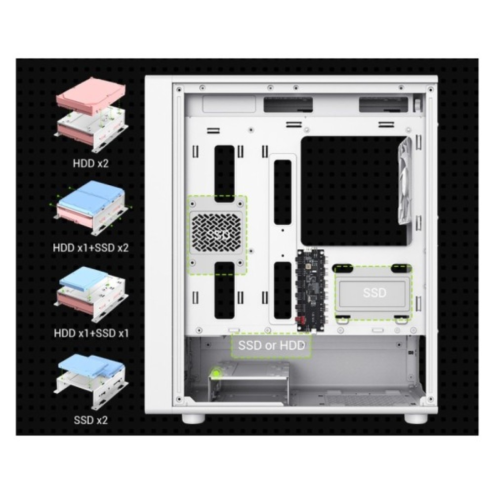 Розширені можливості для зберігання даних забезпечують гнучкість у виборі конфігурації накопичувачів. Gamemax AERIS 330 MW підтримує встановлення до трьох 3.5-дюймових HDD та п'яти 2.5-дюймових SSD, дозволяючи створювати об'ємні та надійні сховища даних для будь-яких завдань.