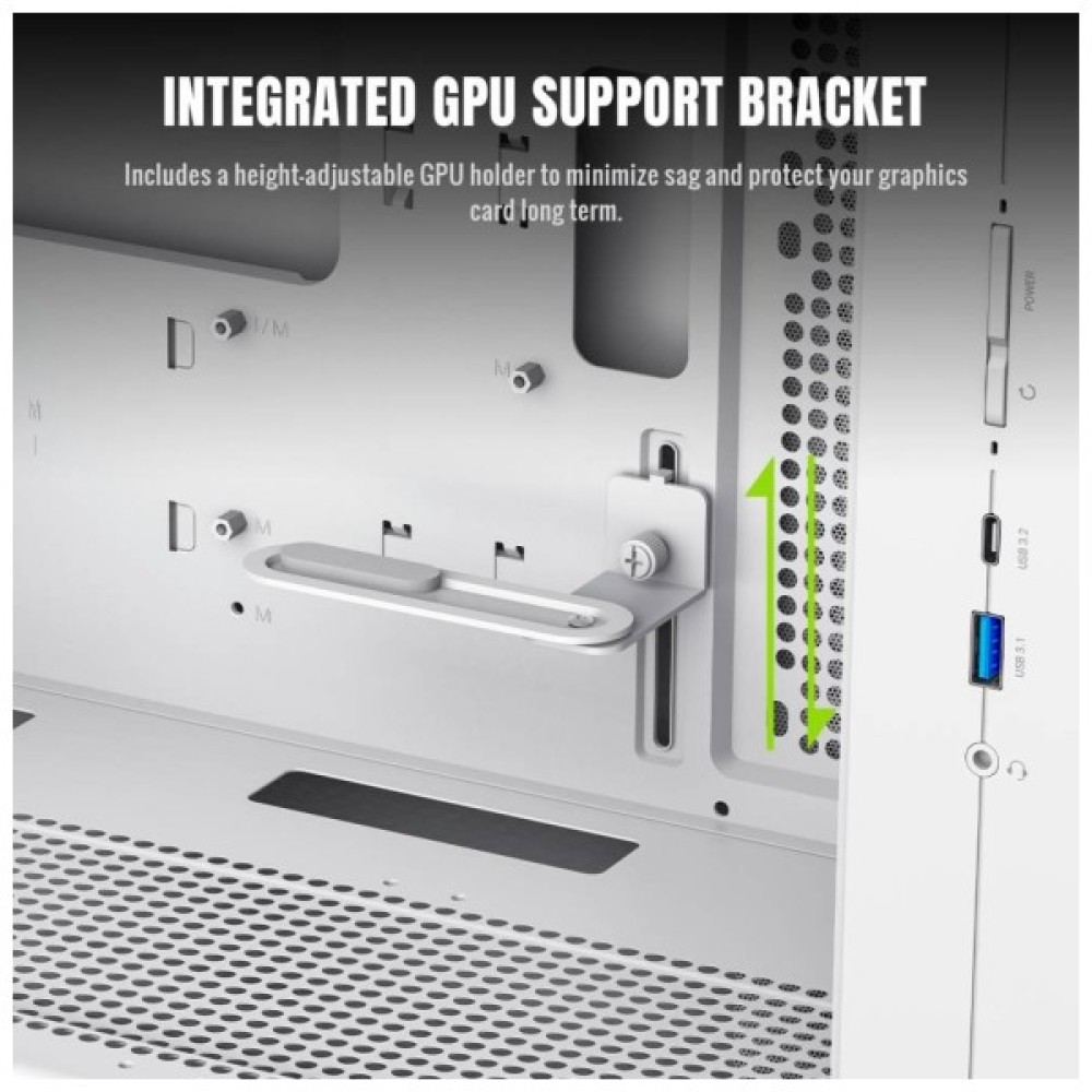 Окремо варто відзначити можливість вертикального встановлення відеокарти, що не тільки покращує її охолодження, але й відкриває нові дизайнерські можливості для креативних рішень у збірці. За потреби можна використовувати довгі відеокарти до 420 мм, що готує Claw 360 WH до підтримки новітніх карт, зокрема NVIDIA 50 Series.