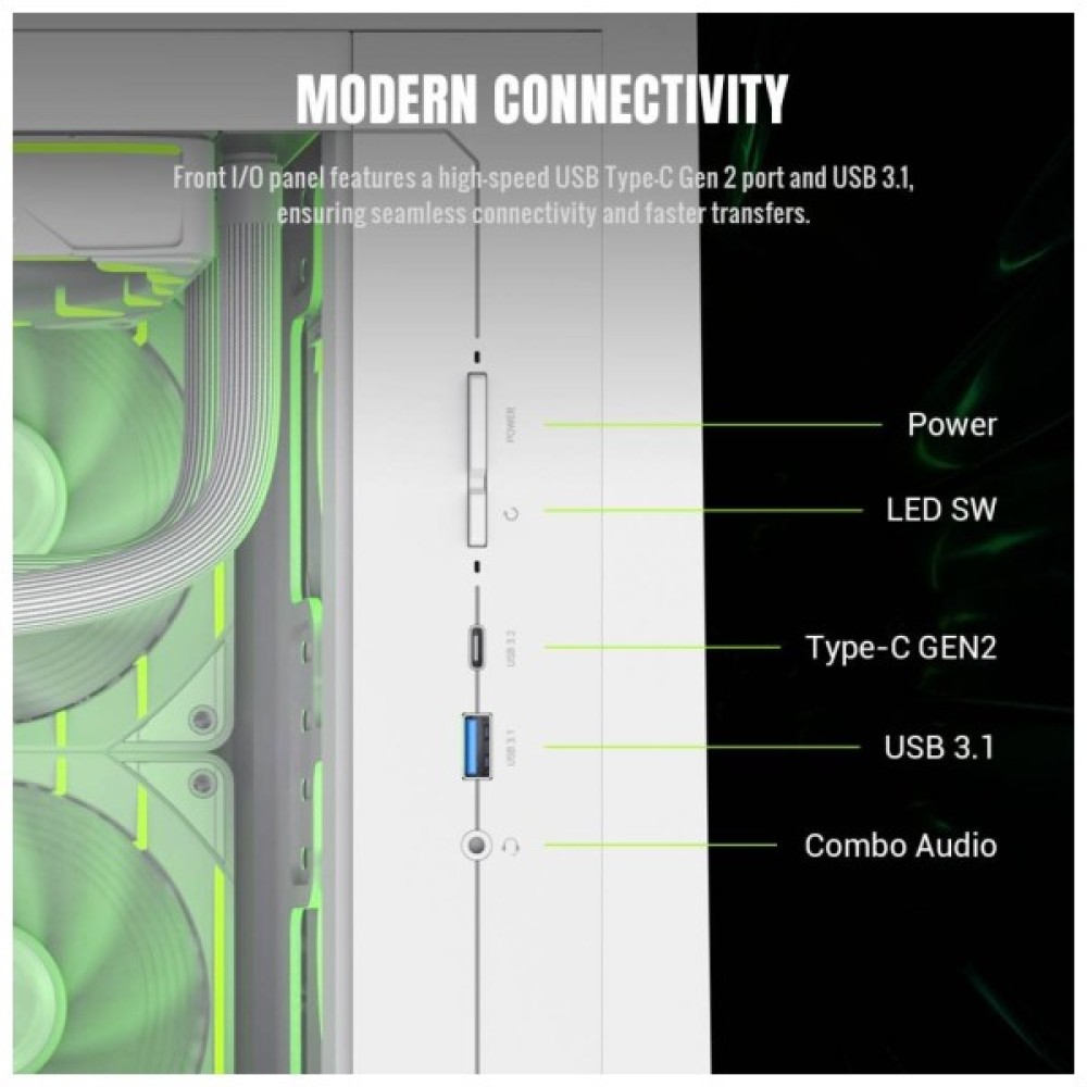 Зовнішні роз'єми, такі як USB 3.1, аудіопорти та мікрофон, надають швидкий доступ до сучасних пристроїв і додаткової периферії, полегшуючи повсякденне використання. Сучасна панель введення-виведення разом із потенціалом для рідинного охолодження в задній та верхній частинах корпусу робить цей продукт універсальним рішенням для будь-якого типу геймінгу.