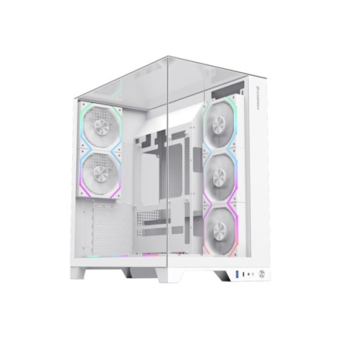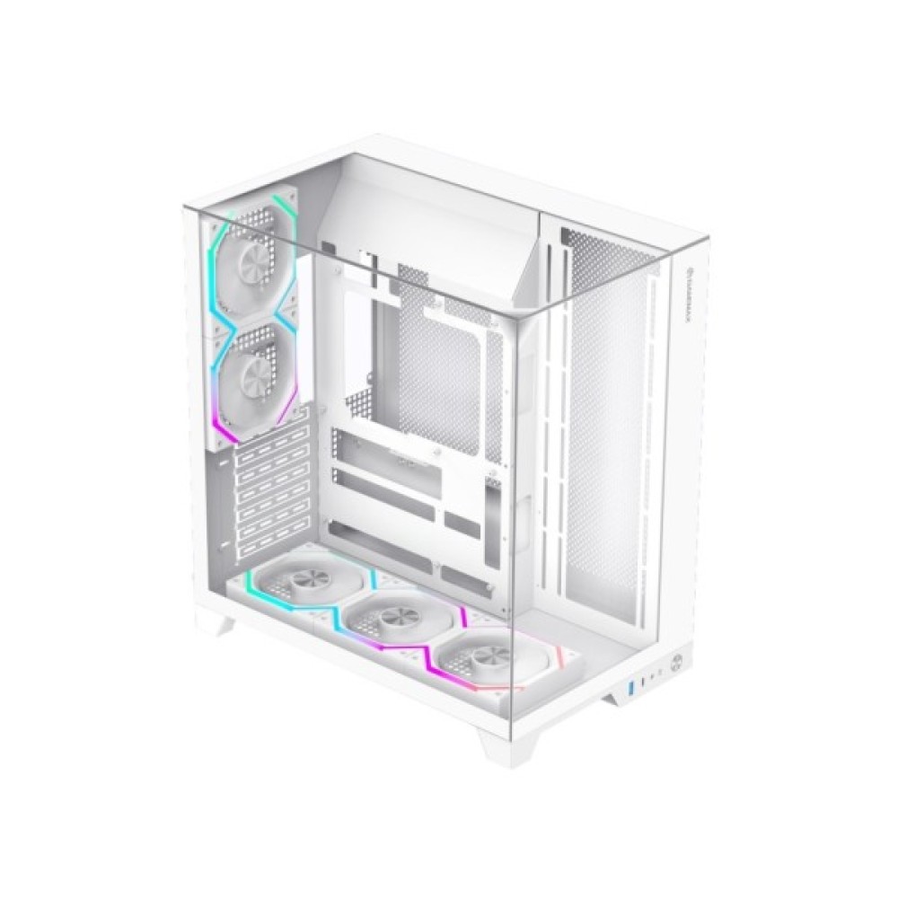Інноваційний дизайн корпусу відзначається трьома панелями із загартованого скла, що дозволяють створити візуальну симфонію, демонструючи потужні компоненти вашої системи у всій їхній величі. Яскраве RGB-освітлення, підкреслене скляними елементами, надає вашій ігровій станції футуристичного образу, відображуючи сучасні тренди у створенні комп'ютерних систем.