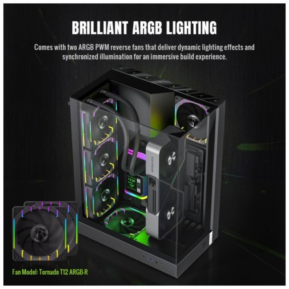Gamemax T20 BK має унікальну конструкцію, що передбачає повернуте на 90° компонування материнської плати. Ця інноваційна особливість покращує потік повітря, допомагаючи підтримувати оптимальну температуру всіх компонентів завдяки природному ефекту стеку. У корпусі передбачено підтримку рідинного охолодження до 360 мм, що в парі з наявністю двох встановлених ARGB PWM вентиляторів дозволяє не тільки забезпечити ефективне охолодження, але й створити вражаючі світлові ефекти, які синхронізуються з вашим обладнанням.