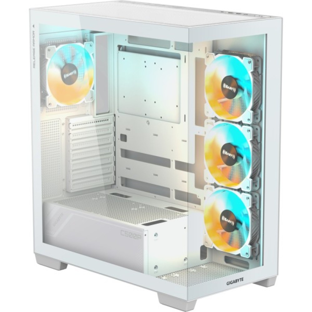 Оптимальне охолодження — це один із ключових аспектів GIGABYTE GB-C500PI ST. Корпус обладнаний чотирма 120 мм вентиляторами з ARGB підсвічуванням, які забезпечують ефективний рух повітря. Крім того, є можливість встановлення додаткових вентиляторів на задній, верхній та боковій панелях, що дозволяє тримати систему на піку продуктивності за будь-яких навантажень.