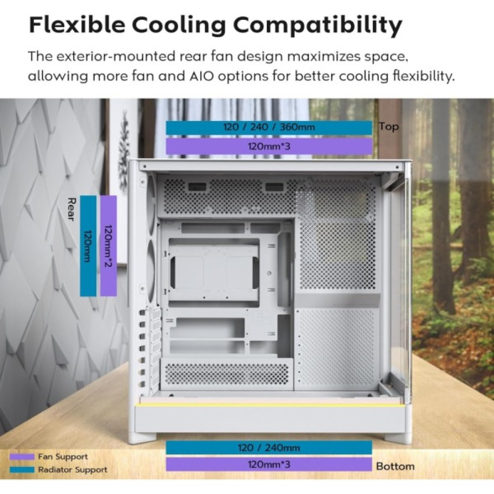 Модель MONTECH HS01 PRO (W) особлива своєю ефективною системою охолодження. З п'ятьма попередньо встановленими вентиляторами розміром 120 мм та можливістю установки додаткових вентиляторів на дні, вирішити проблему перегріву абсолютно легко. Підтримка рідинного охолодження розширює можливості вашої системи: кріплення для радіаторів передбачено на задній (120 мм), верхній (до 360 мм) та нижній (до 240 мм) панелях. Це дозволяє зберігати оптимальну температуру навіть при інтенсивних іграх або професійних комп'ютерних обрахунках.