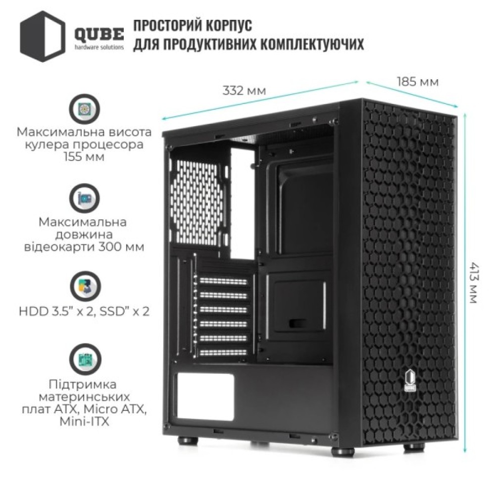 Ключовою особливістю є можливість встановлення довгих відеокарт до 300 мм завдовжки, а також процесорних кулерів висотою до 155 мм. Це робить Qube CARNIVAL_FCNU3 універсальним рішенням для ентузіастів, які прагнуть налаштувати свою систему до найвищого рівня продуктивності.