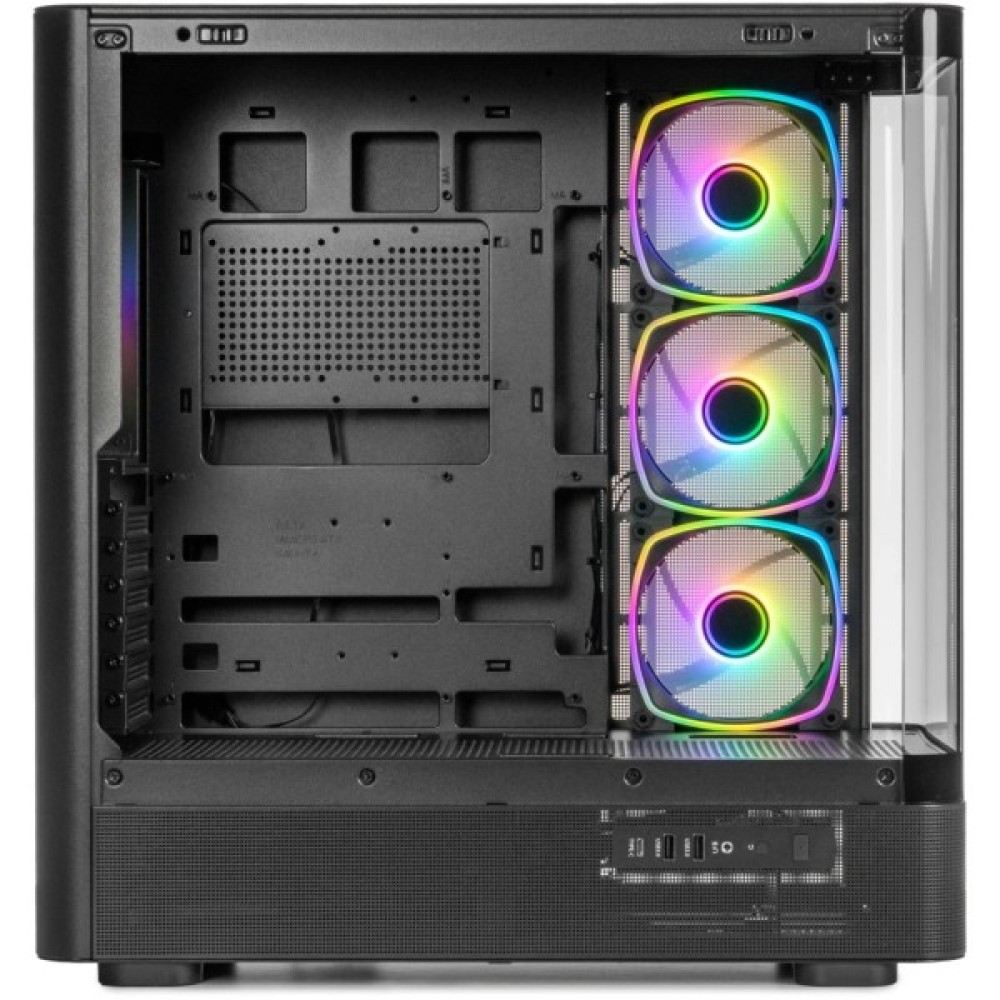 Практичні інтерфейси на передній панелі, включаючи 2 USB 2.0 та аудіо роз'єми, покликані забезпечити легкий доступ до периферійних пристроїв, роблячи використання системи максимально зручним і ефективним. Функціональність корпуса доповнюється добре організованим внутрішнім простором з багатьма відсіками: 2 зовнішні 5.25" та 3 внутрішні 3.5" відсіки, а також 2 внутрішні 2.5" для встановлення SSD або HDD, дарують можливість налаштовувати систему під конкретні завдання.