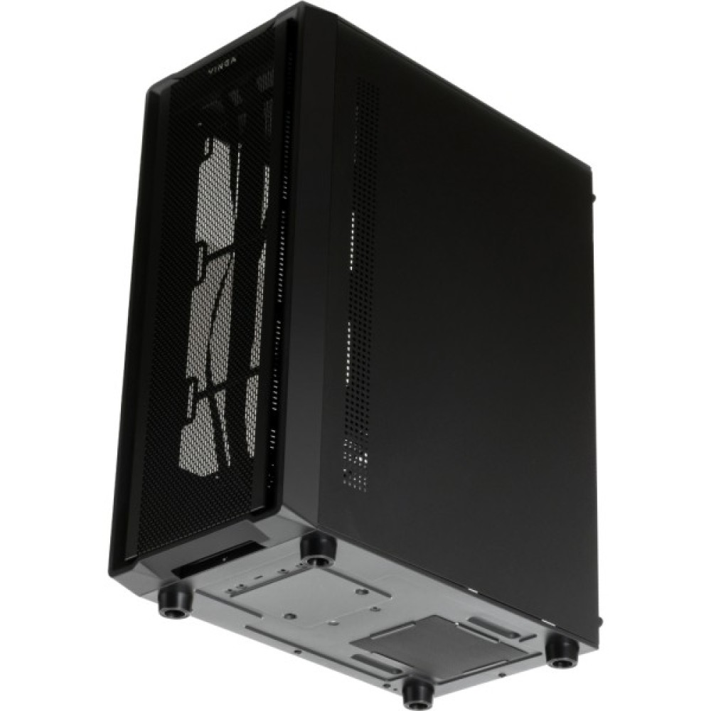 Корпус Vinga CS216B дозволить сконструювати непоганий геймерський комп'ютер: система вентиляції з вентиляційними гратами забезпечує нормальний температурний режим навіть при повному завантаженні. У корпусу є бічній панелі з загартованого скла - вона прозора, тому користувач може побачити, як працює «начинка» корпусу. Місце для блоку живлення знаходиться на дні корпусу, це допомагає погасити вібрацію і зробити рівень шуму нижче навіть при повному навантаженні. На корпусі розташовані кнопки управління живленням і завантаженням системи, а також входи для навушників, USB-порти і входи для мікрофона. Максимально прийнятна висота кулера центрального процесора - 155 мм.