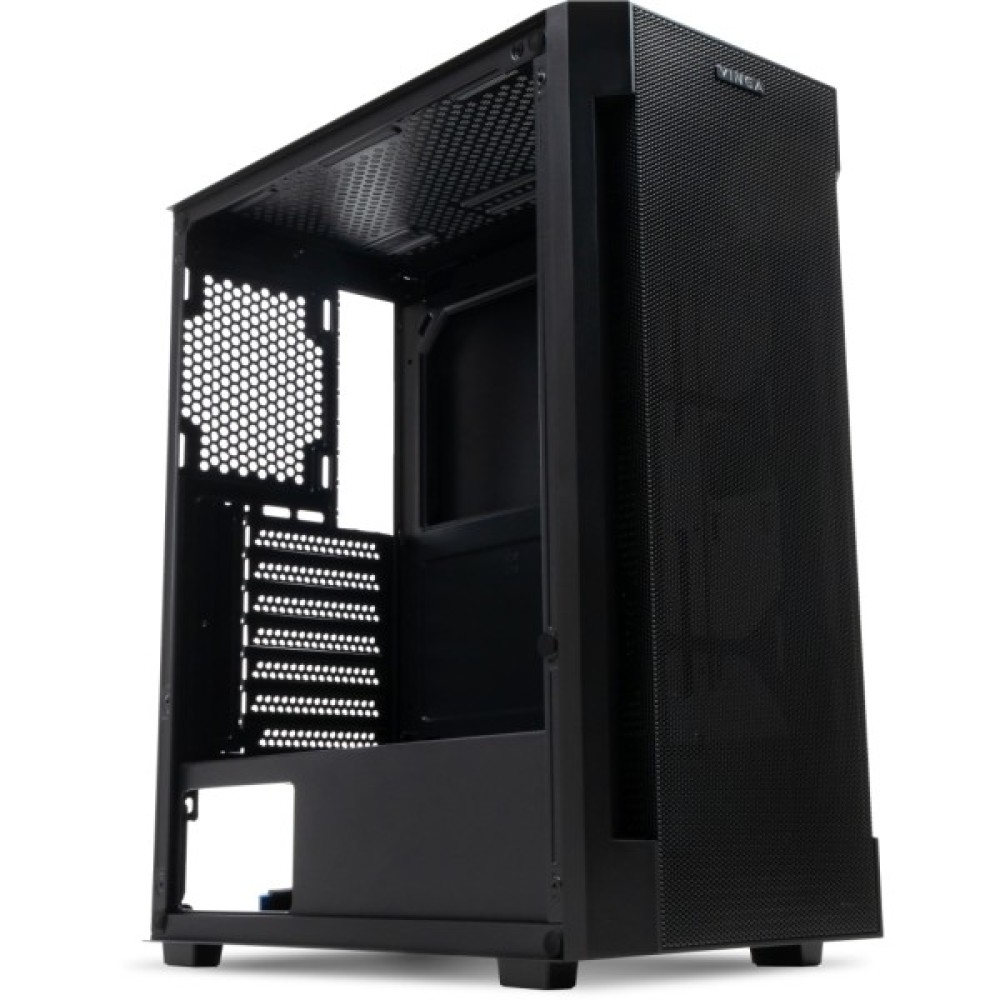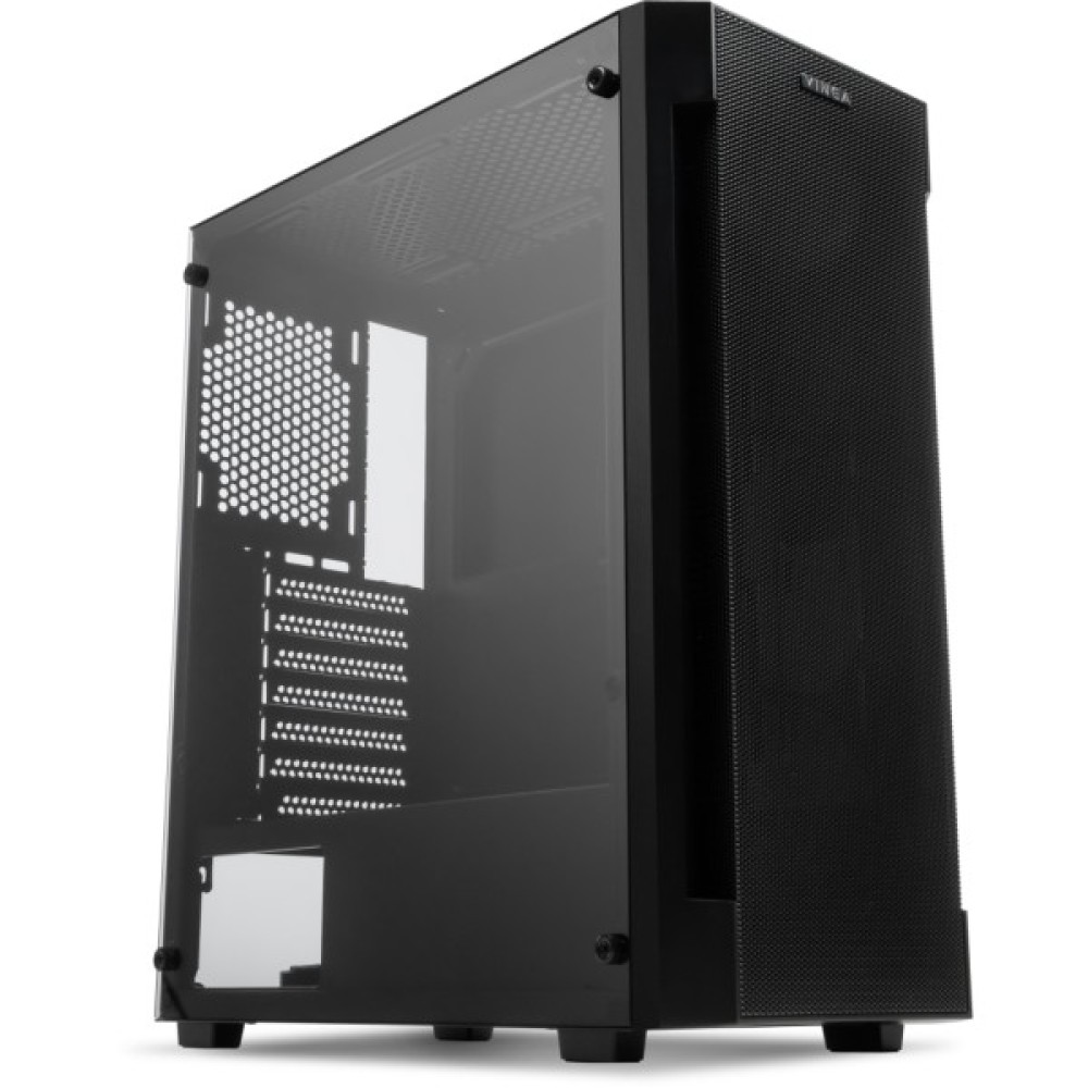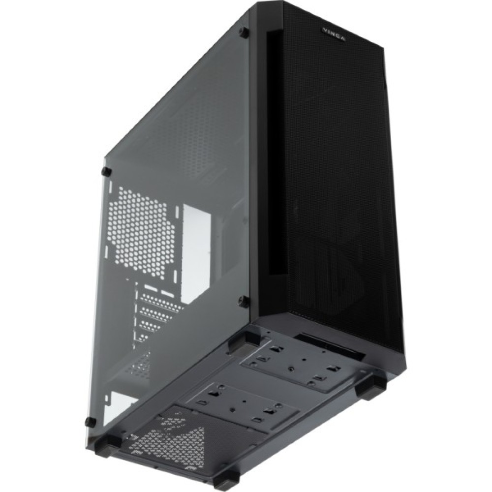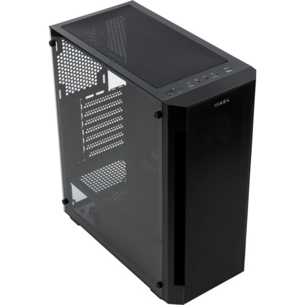 Корпус Vinga Gladius дозволить сконструювати непоганий геймерський комп'ютер: система вентиляції з вентиляційними гратами забезпечує нормальний температурний режим навіть при повному завантаженні. У корпусу є бічній панелі з загартованого скла - вона прозора, тому користувач може побачити, як працює «начинка» корпусу. Місце для блоку живлення знаходиться на дні корпусу, це допомагає погасити вібрацію і зробити рівень шуму нижче навіть при повному навантаженні. На корпусі розташовані кнопки управління живленням і завантаженням системи, а також входи для навушників, USB-порти і входи для мікрофона. Максимально допустимий розмір карт для установки - до 340 мм, максимально прийнятна висота кулера - 165 мм.