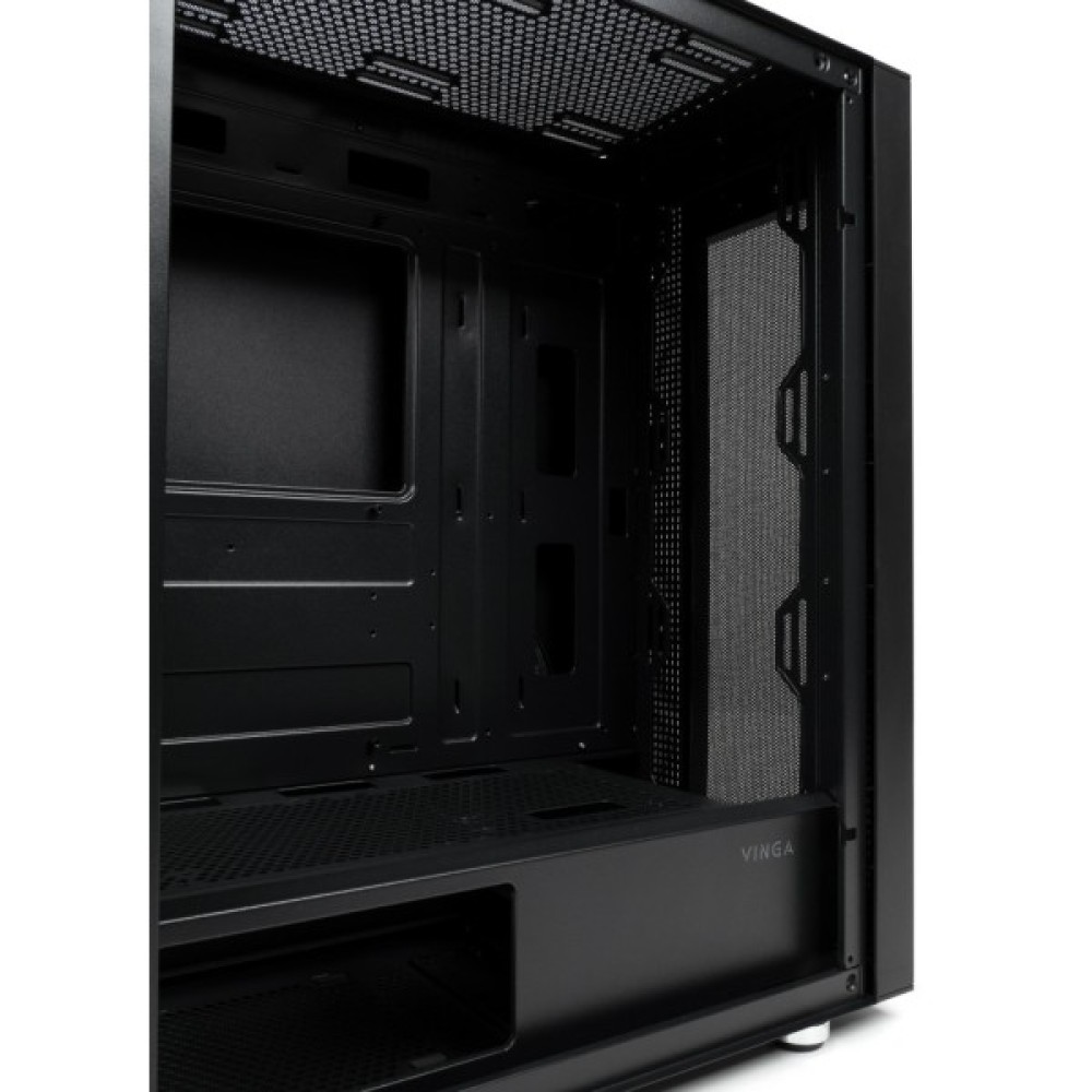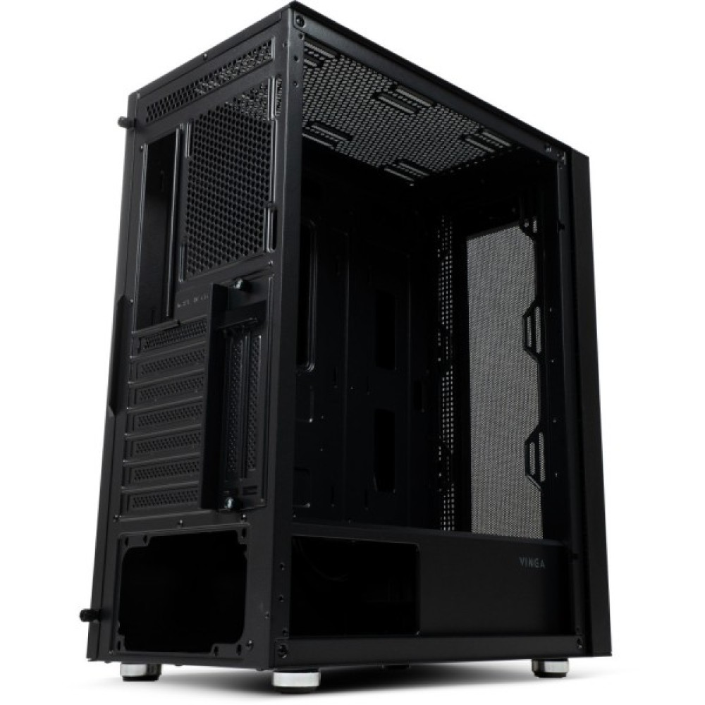 Корпус Vinga Tomcat дозволить сконструювати непоганий геймерський комп'ютер: система вентиляції з вентиляційними гратами забезпечує нормальний температурний режим навіть при повному завантаженні. У корпусу є  бічна панель з загартованого скла - вона прозора, тому користувач може побачити, як працює «начинка» корпусу. Місце для блоку живлення знаходиться на дні корпусу, це допомагає погасити вібрацію і зробити рівень шуму нижче навіть при повному навантаженні. На корпусі розташовані кнопки управління живленням і завантаженням системи, а також входи для навушників, USB-порти і входи для мікрофона. Максимально допустимий розмір карт для установки - до 345 мм, максимально прийнятна висота кулера - 163 мм.
