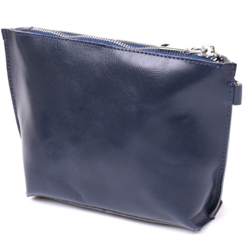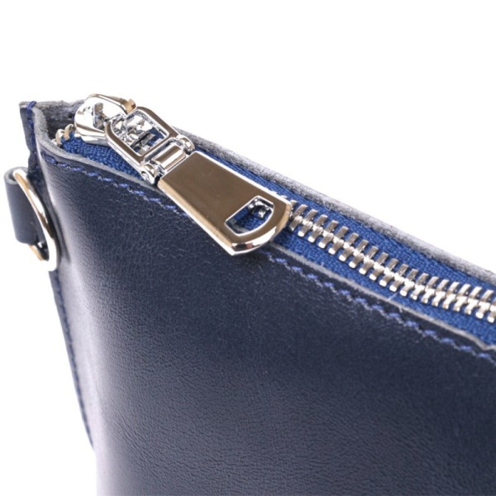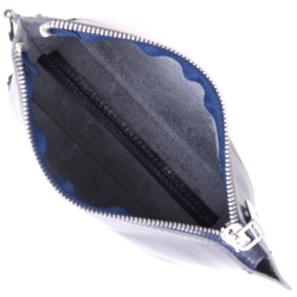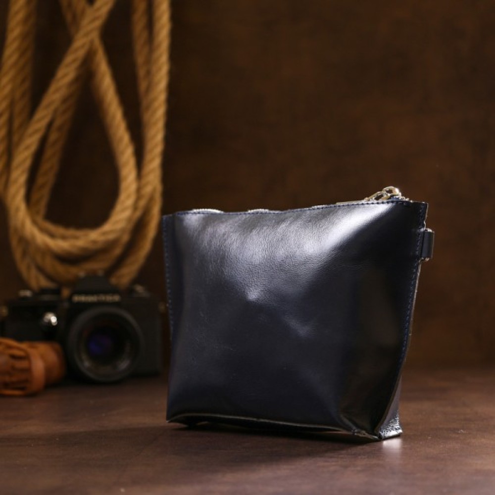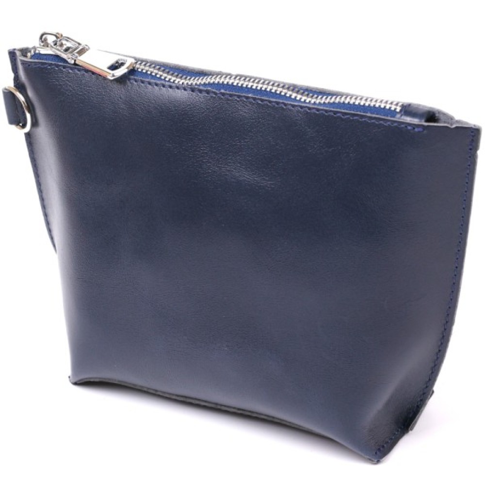 Добротна косметичка жіноча невеликого розміру для дрібних речей від українського виробника. Виконана з натуральної висококласної шкіри підвищеної міцності та стійкості до зношування. Колір виробу – темно-синій з легким відливом, фактура – гладка та приємна на дотик. Закривається аксесуар на блискавку срібного кольору.