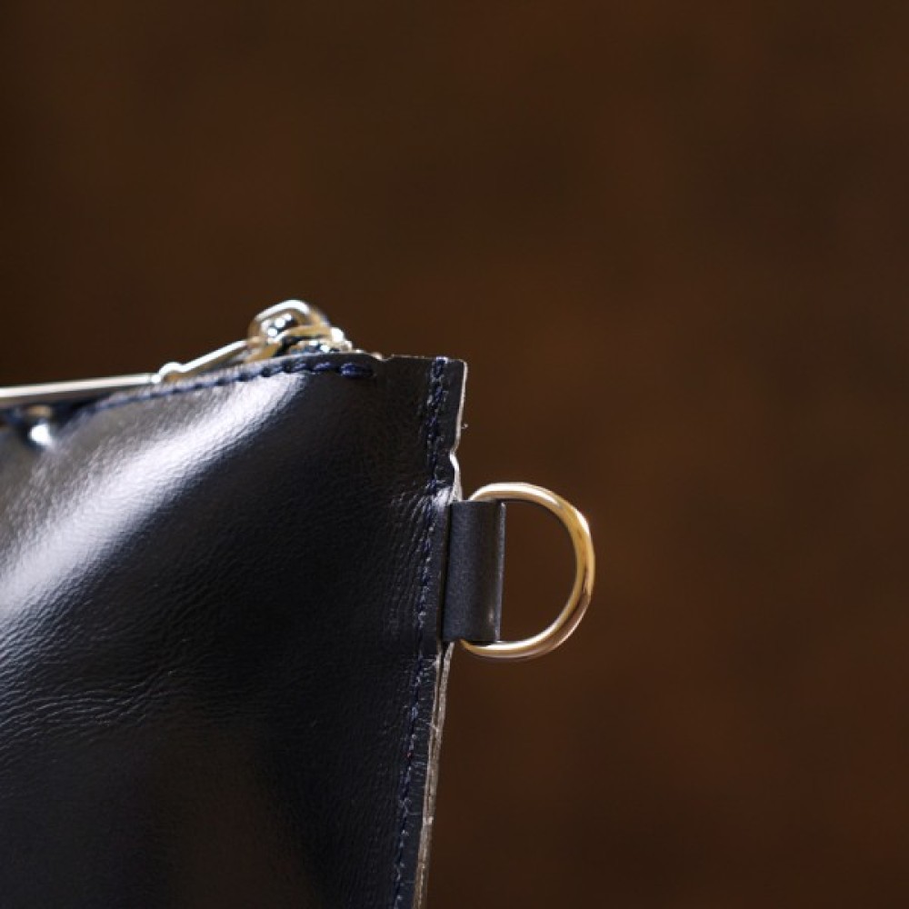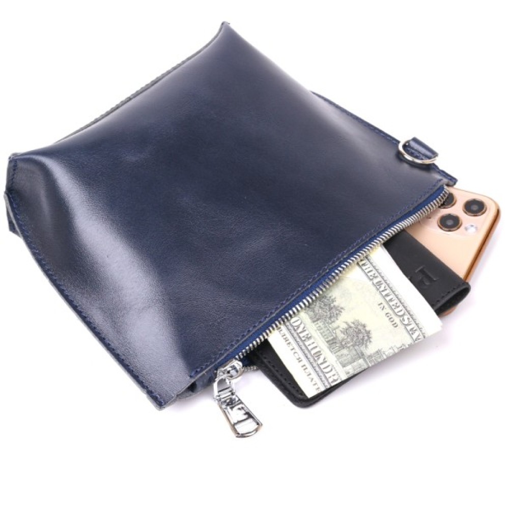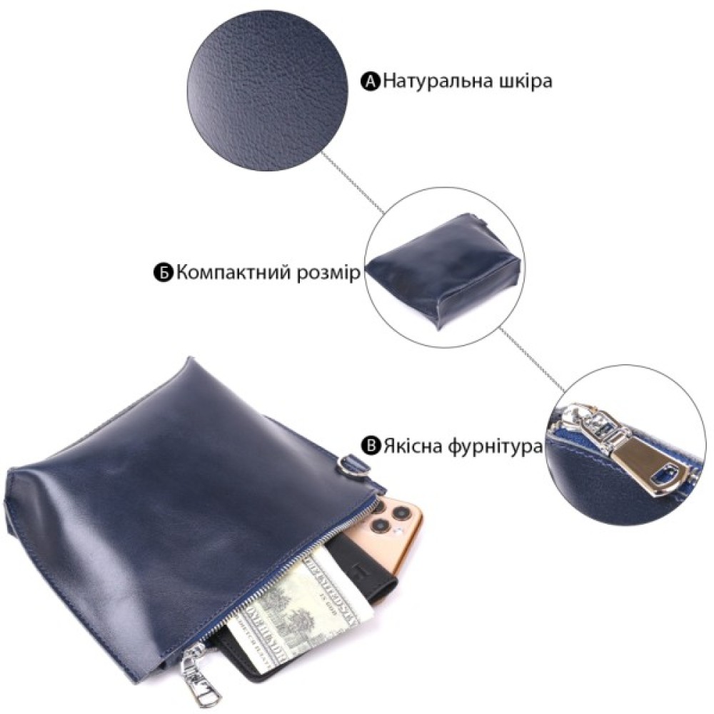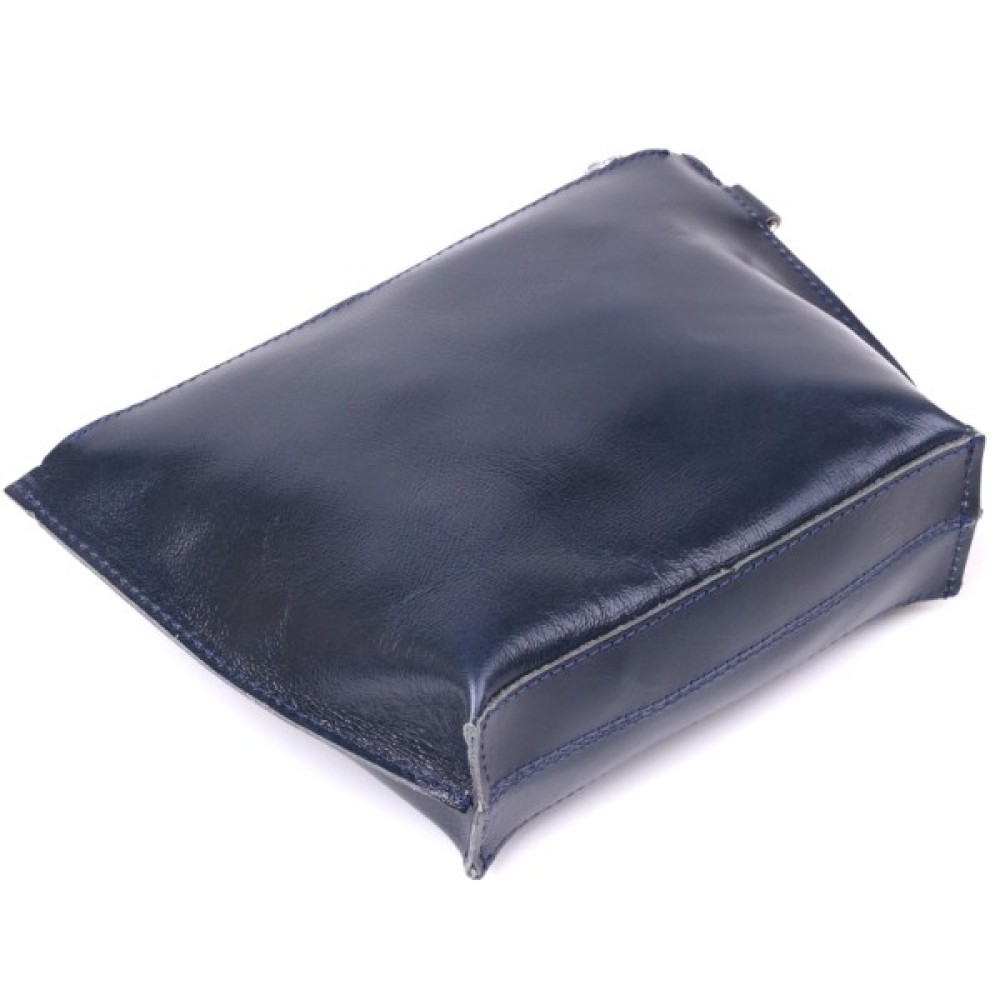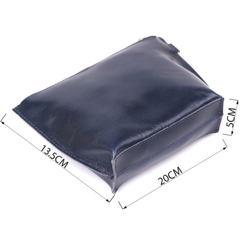 Добротна косметичка жіноча невеликого розміру для дрібних речей від українського виробника. Виконана з натуральної висококласної шкіри підвищеної міцності та стійкості до зношування. Колір виробу – темно-синій з легким відливом, фактура – гладка та приємна на дотик. Закривається аксесуар на блискавку срібного кольору.