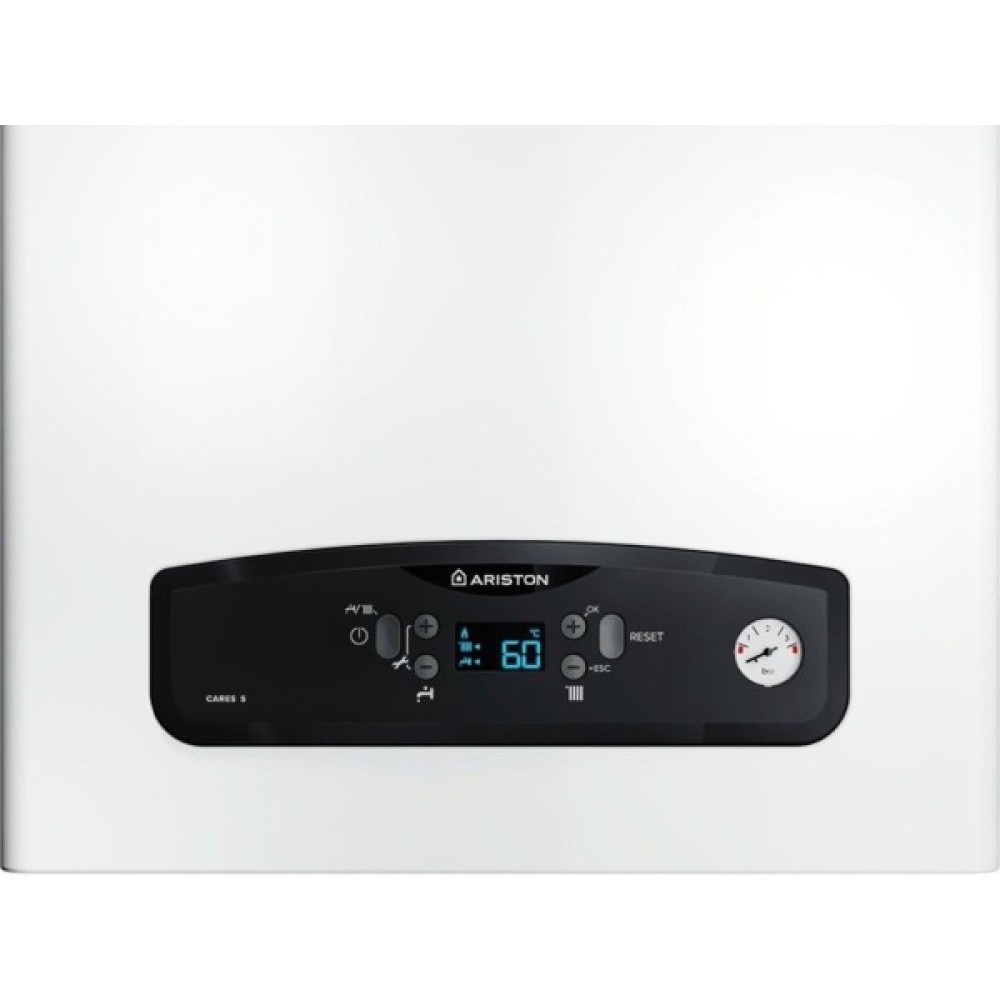 Одноконтурний конденсаційний котел Ariston Cares S 24. Настінний газовий котел із закритою камерою згоряння Ariston Cares S 24. Котел торгової марки Ariston призначений для опалення приміщень та нагрівання гарячої води. Чіткий рідкокристалічний дисплей відображає задану температуру, активовані функції та роботу котла загалом.