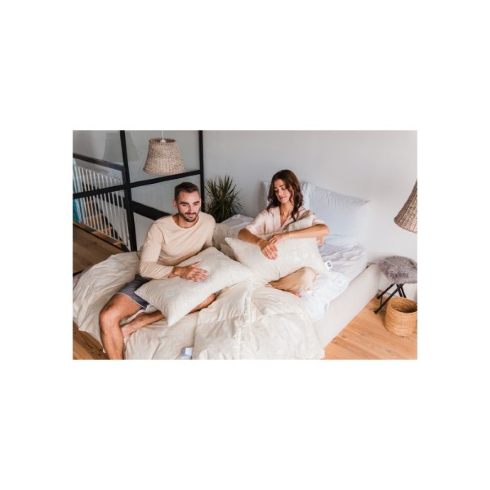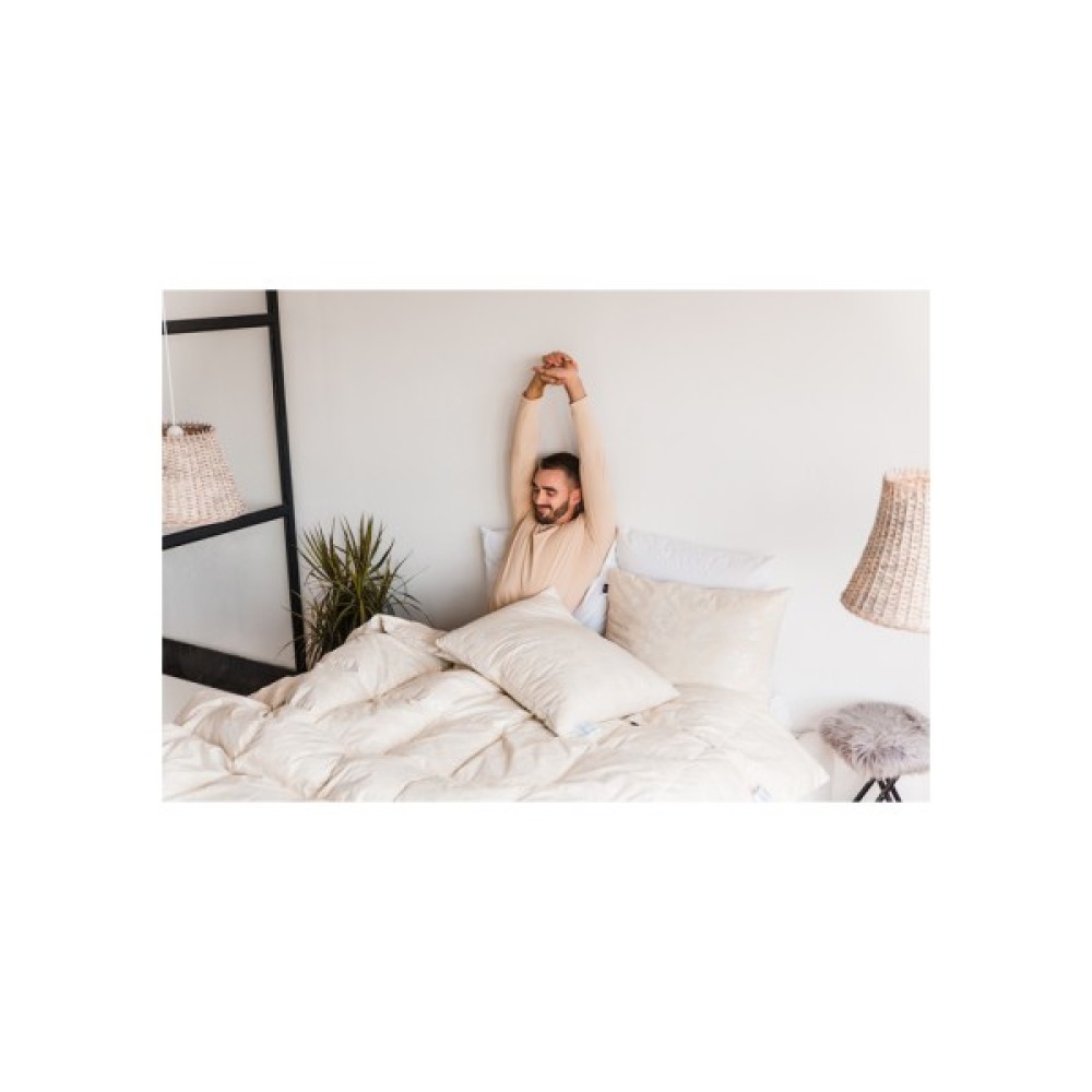Здоровий сон пух. Жоден з наповнювачів не зрівняється за унікальними властивостями натурального пуху. Пух, який використовується при виробництві постільної білизни MirSon, виключно високої якості, що гарантує неперевершений результат: пухнасті, легкі, теплі, абсолютно без запаху і пилу, антиалергенні подушки і ковдри.Тканина тік бежева роза. Це щільна бавовняна тканина, яка не пропускає пух та пір'я. Основними плюсами цієї тканини є: хороша гігроскопічність і повітропроникність, а також зносостійкість та довговічність. До основних переваг матерії можна віднести натуральний склад і гарну міцність.Наповнювач 90% пух "Екстра". "Екстра" 90% пух — високоякісний пух, який відповідає світовим стандартам якості. Показники по м'якості та пружності пуху контролюються лабораторно і гарантовано знаходяться в межах норми, становлять 550-600 Fill Power, що можна порівняти з наповнювачем, який використовують європейські виробники для виробництва своїх пухових виробів.Класифікація пуху. Спосіб пошиття ковдри (Hand Made). Унікальне відношення до найдрібніших деталей, світові стандарти якості, контроль на всіх етапах виробництва — все це Hand Made. Два товари можуть бути візуально схожі один на одного, але обов'язково знайдуться відмінності, що притаманні ручній роботі, так би мовити почерк майстра.