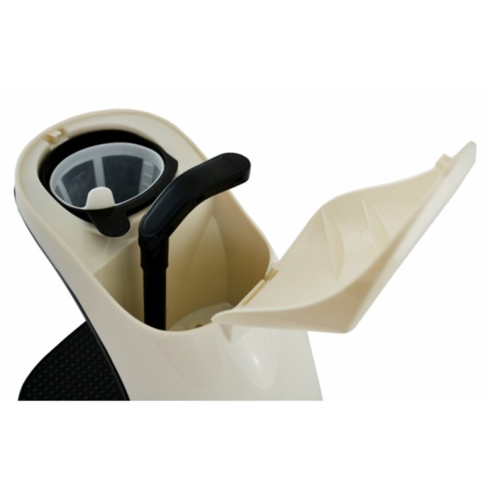 Усередині корпусу розміщується блок для води і фільтр для кави. Коли ви наповнюєте їх вмістом, після чого активуєте кавоварку, відбувається нагрів, в результаті якого речовини з кави опиняються у воді. Після цього готовий напій по краплині переганяється в чашки. Кнопка управління на корпусі світиться червоним світлом, поки відбувається заварювання і активна робота.