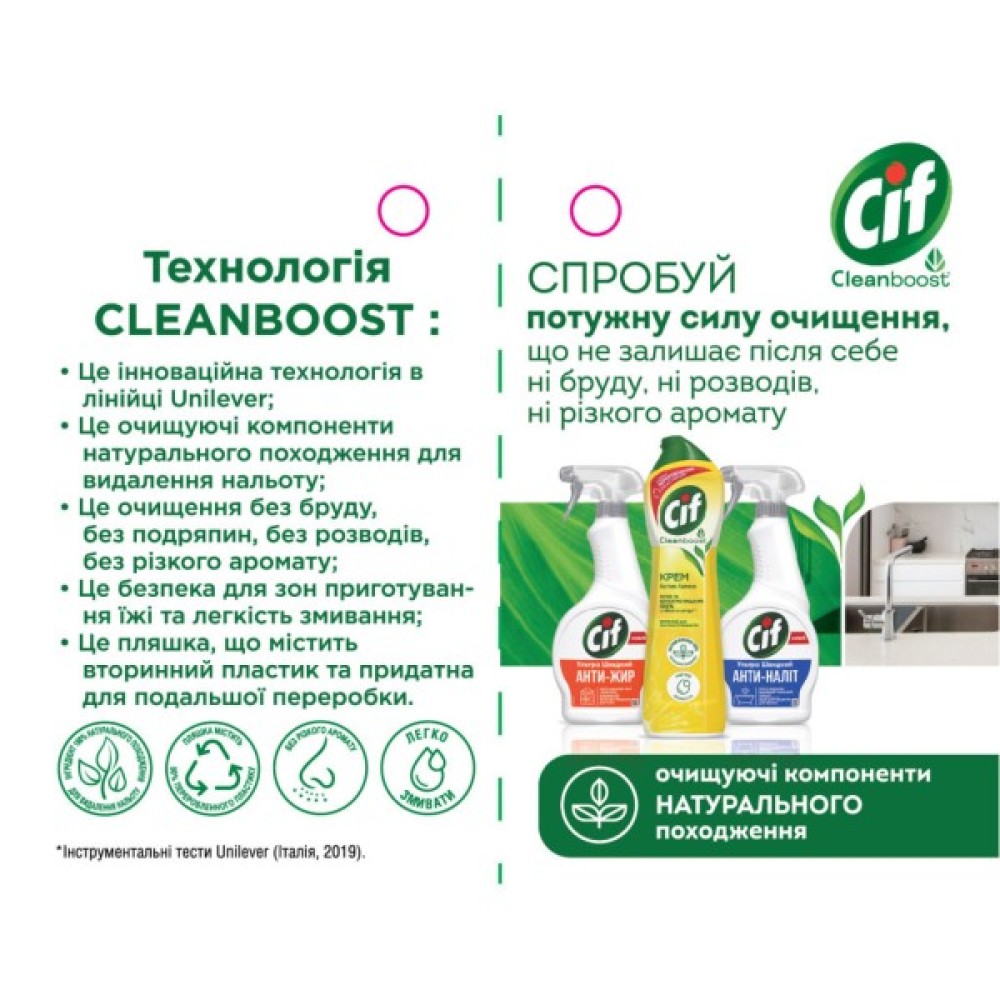 Завдяки унікальній формулі з особливими мікрогранулами, крем Cif ефективно впорається з найскладнішими забрудненнями, не пошкоджуючи поверхню й не залишаючи на ній подряпин.