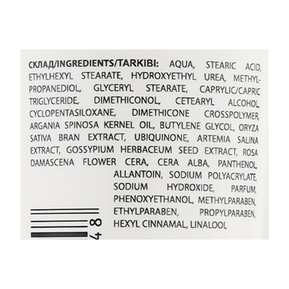 Склад Aqua, Stearic Acid, Ethylhexyl Stearate, Hydroxyethyl Urea, Menthoxypropanediol, Glyceryl Stearate, Caprylic/Capric Triglyceride, Dimethiconol, Cetearyl Alcohol, Cyclohexasiloxane, Dimethicone Crosspolymer, Argania Spinosa Kernel Oil, Butylene Glycol, Glycosphingolipids, Ubiquinone, Artemia Salina Extract, Gossypium Herbaceum Seed Extract, Rosa Damascena Flower Cera, Cera Alba, Panthenol, Allantoin, Sodium Polyacrylate, Sodium Hydroxide, Parfum, Phenoxyethanol, Methylparaben, Ethylparaben, Propy