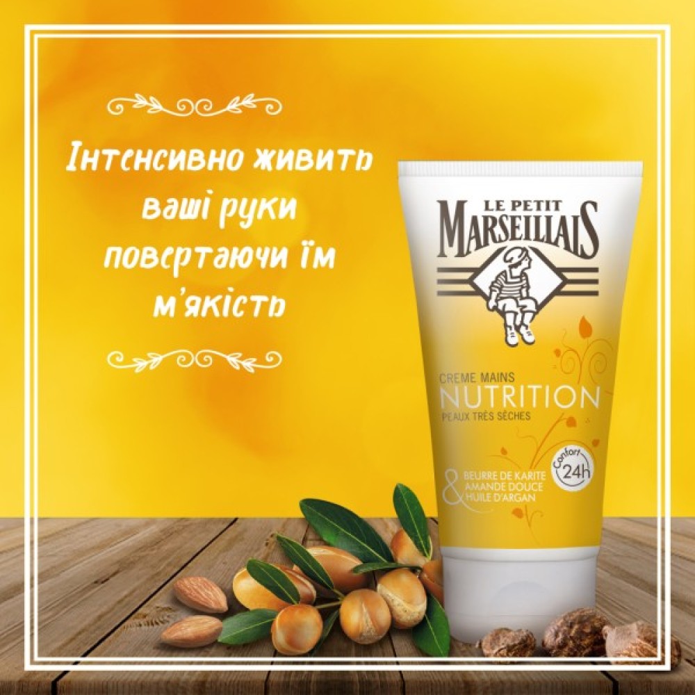 Le Petit Marseillais® Живильний крем для рук "Каріте, Солодкий мигдаль і Масло арганового дерева". Щоб подбає про ваших руках, Le Petit Marseillais® пов'язав 3 прекрасних інгредієнта масло каріте, солодкий мигдаль і масло арганового дерева в ЖИВИЛЬНИЙ КРЕМ ДЛЯ РУК для дуже сухої шкіри. Крем має легку текстуру, чудовим ароматом, швидко вбирається, не залишаючи липких слідів. Ваші руки м'які і увлаженной протягом 24 годин.