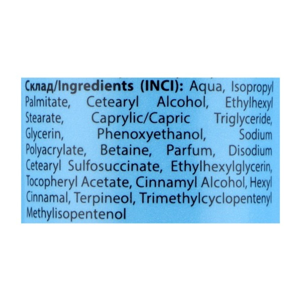 Aqua, Isopropyl Palmitate, Cetearyl Alcohol, Ethylhexyl Stearate, Caprylic/Capric Triglyceride, Glycerin, Phenoxyethanol, Sodium Polyacrylate, Betaine, Parfum, Disodium Cetearyl Sulfosuccinate, Ethylhexylglycerin, Tocopheryl Acetate, Cinnamyl Alcohol, Hexyl Cinnamal, Terpineol, Trimethylcyclopentenyl Methylisopentenol.