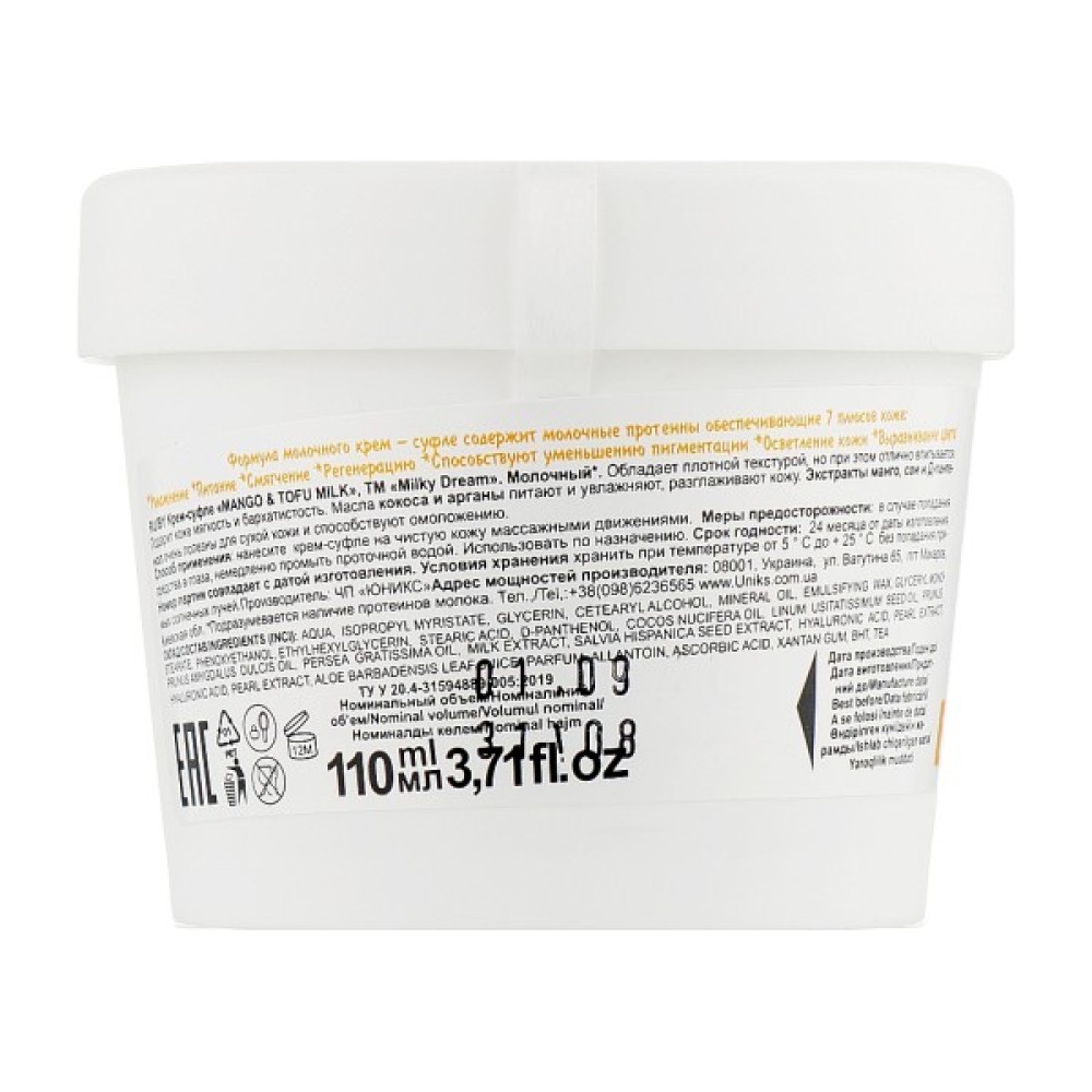 «Манго і Тофу з молоком» - дуже ніжний крем-суфле від Milky Dream. Б’юті-ласощі подбають про красу та здоров'я шкіри тіла. До складу продукту увійшли масло кокоса та олія манго, молочні протеїни, Д-пантенол, екстракти манго та сої. Завдяки такому складу активних компонентів засіб забезпечує шкірі тривале зволоження, глибоке живлення, захист від сухості та лущення. Суфле швидко абсорбується і залишить шкірний покрив ідеально гладеньким, м'яким і неймовірно шовковистим.
