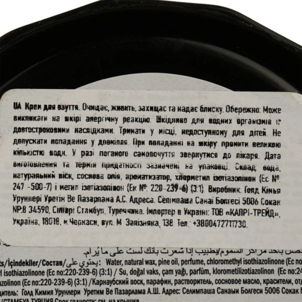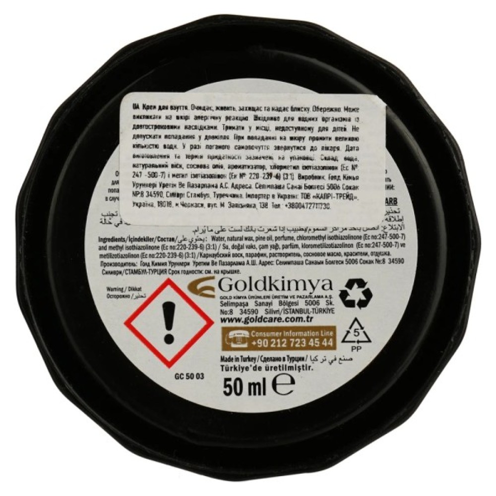 Goldcare паста для взуття чистить, живить і захищає шкіру взуття. Баночка закрита алюмінієвою фольгою для тривалого зберігання. Після остаточного намащування шару пасти на поверхню взуття щіткою доводиться до блиску.